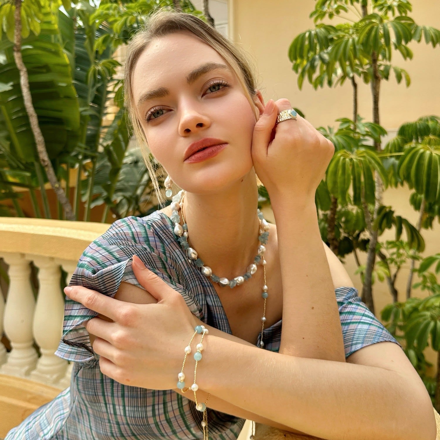 Features natural cultured Baroque pearls, natural aquamarine, and 14k gold plated brass.
