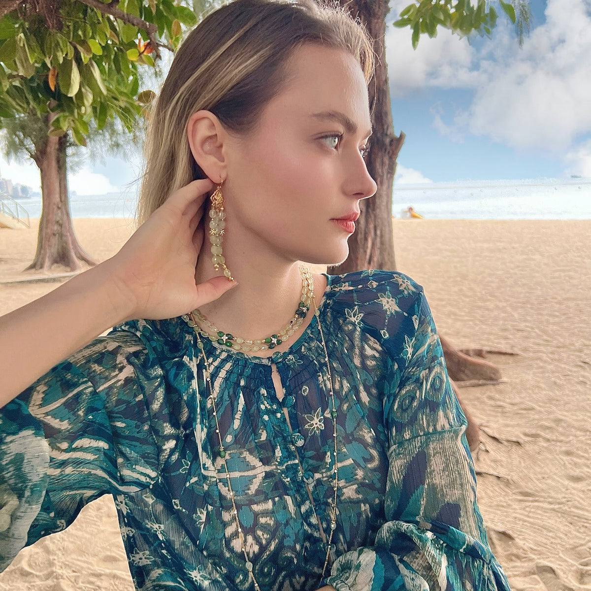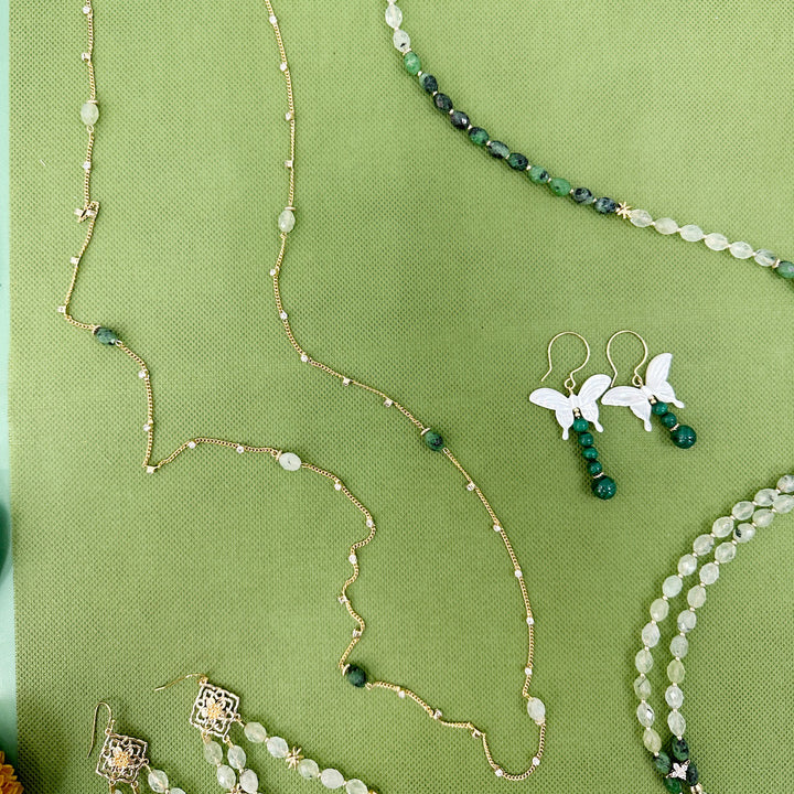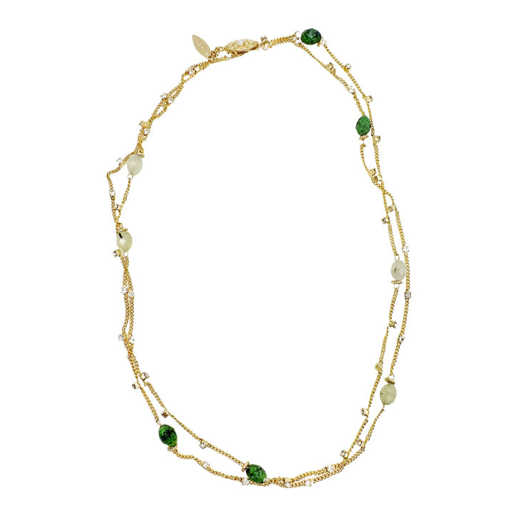 This necklace features a gold chain with zircon stones and prehnite and green gemstone beads.