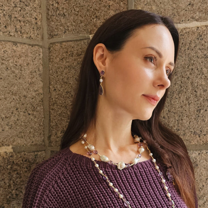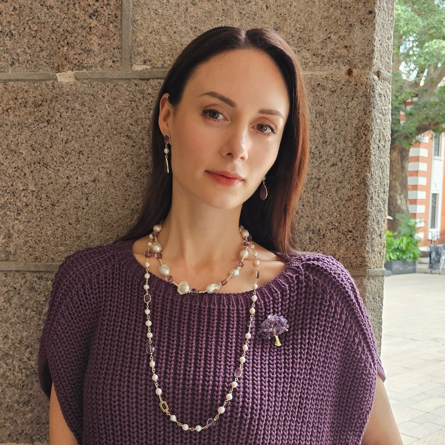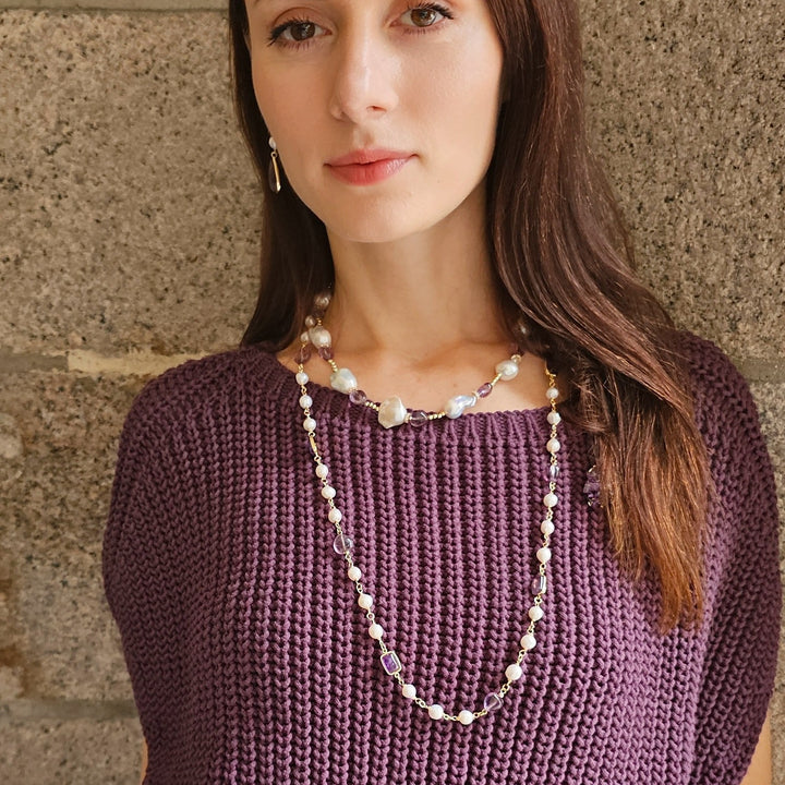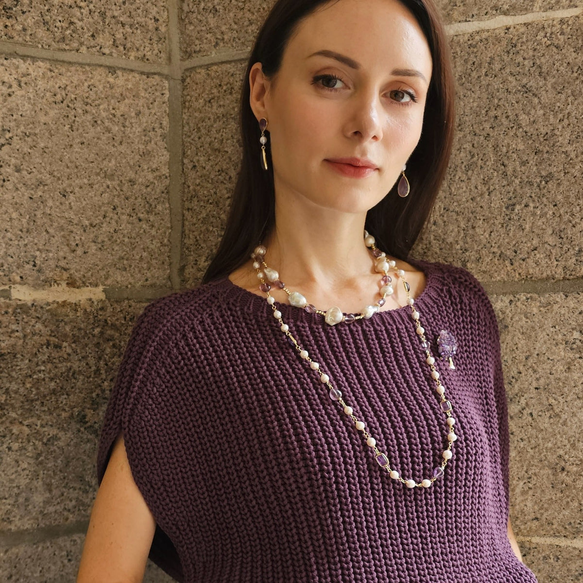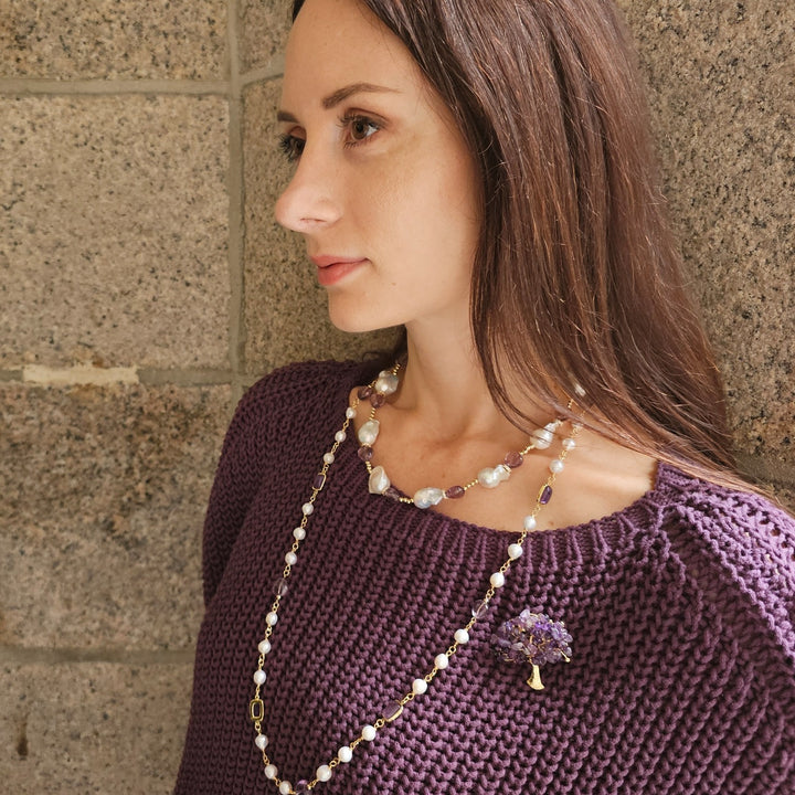 This Freshwater Pearls With Amethyst Long Necklace by Farra is a meaningful and beautiful piece that combines stylish design with positive energy. It features lustrous freshwater pearls elegantly interspersed with stunning amethyst gemstones. Amethyst, the birthstone for February, is known for its calming properties. The long design makes this necklace versatile, perfect for wearing as a single strand or layered for a richer look.