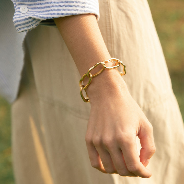 The Roots Bracelet by Fersera pays homage to the Tuscan mountains with its fluid, continuous lines. The elegant design symbolizes constant evolution and renewal, while the 18kt gold-plated chain, coated with a special "Cataphoresis" treatment, ensures a long-lasting shine and durability.