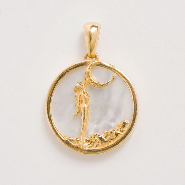 This pendant is crafted from 18ct gold-plated sterling silver and features a Mother of Pearl inlay.