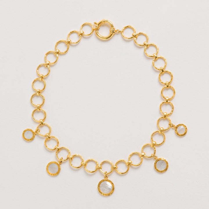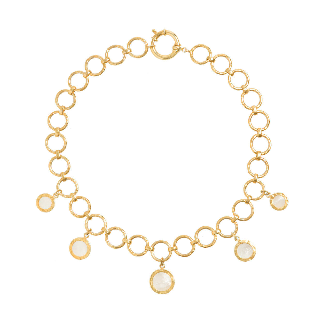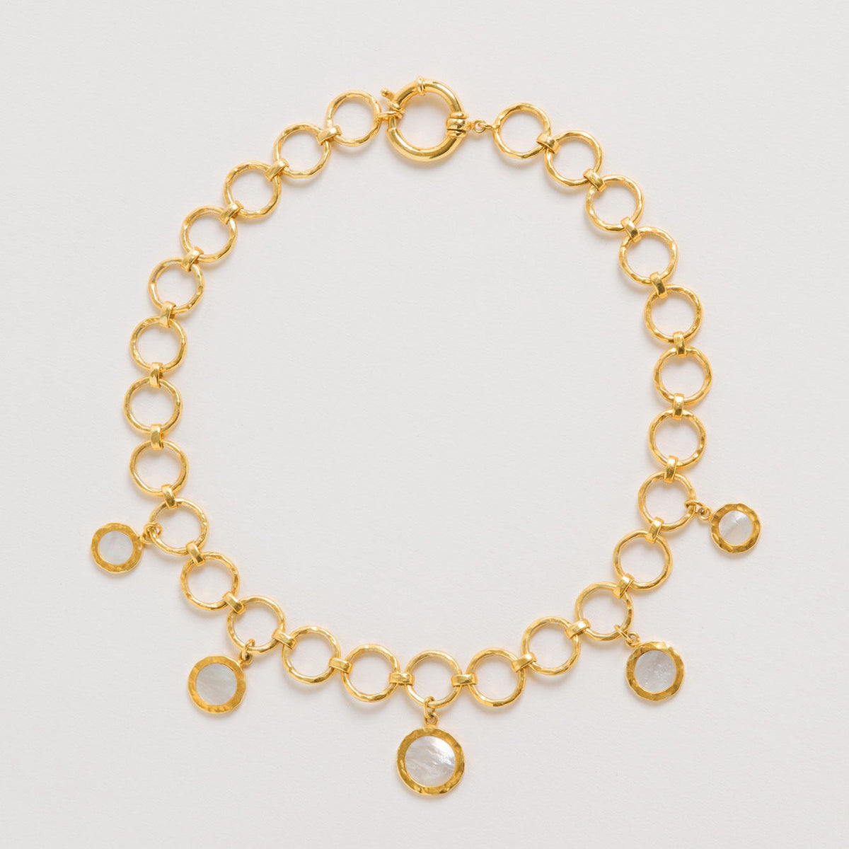 The Forged Circular Necklace, Gold by Freya Rose is a sophisticated and versatile accessory. This 18ct gold-plated sterling silver necklace features intricately designed Mother of Pearl charms that embody the natural elegance of raw, organic forms. Its minimalistic design and luxurious materials make it perfect for both daily wear and an evening out.
