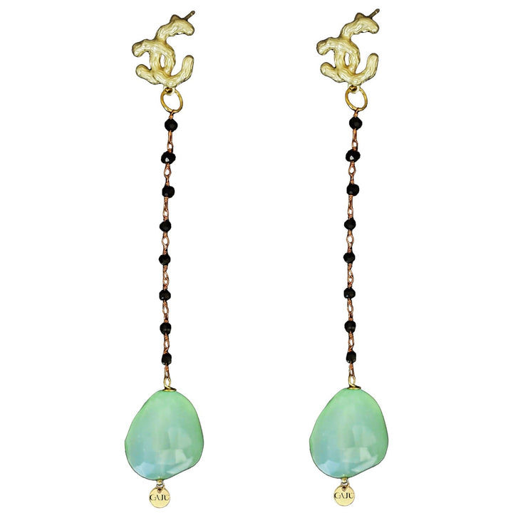 The Imerovigli Earrings by Gajú are a versatile and timeless accessory. Handcrafted in Italy, they feature raw tourmaline and onyx stones, highlighting their natural beauty and unique character. The gold plating and nickel-free design ensure that these stunning dangle earrings are both safe and elegant.