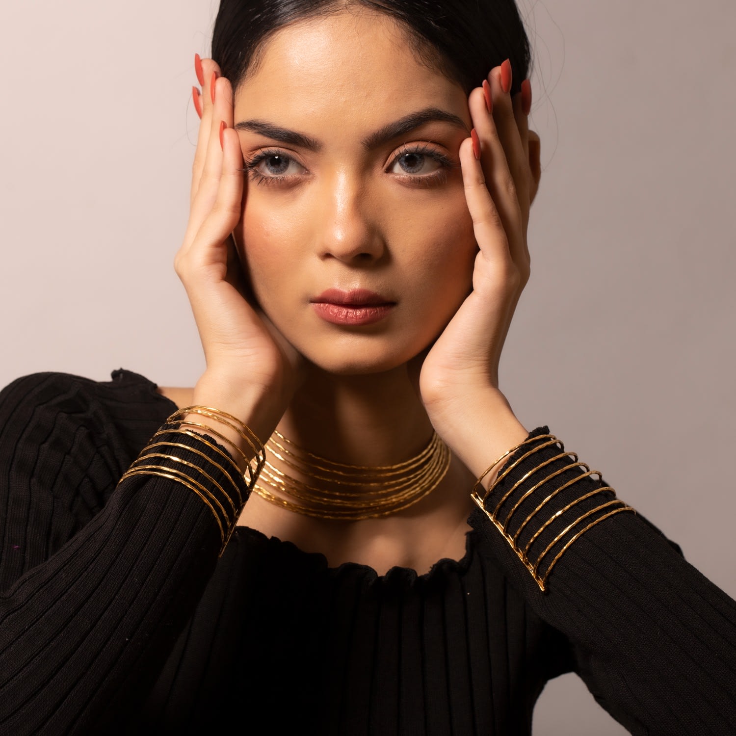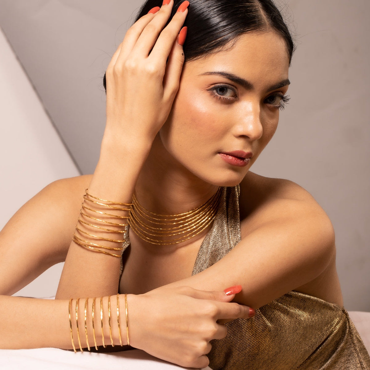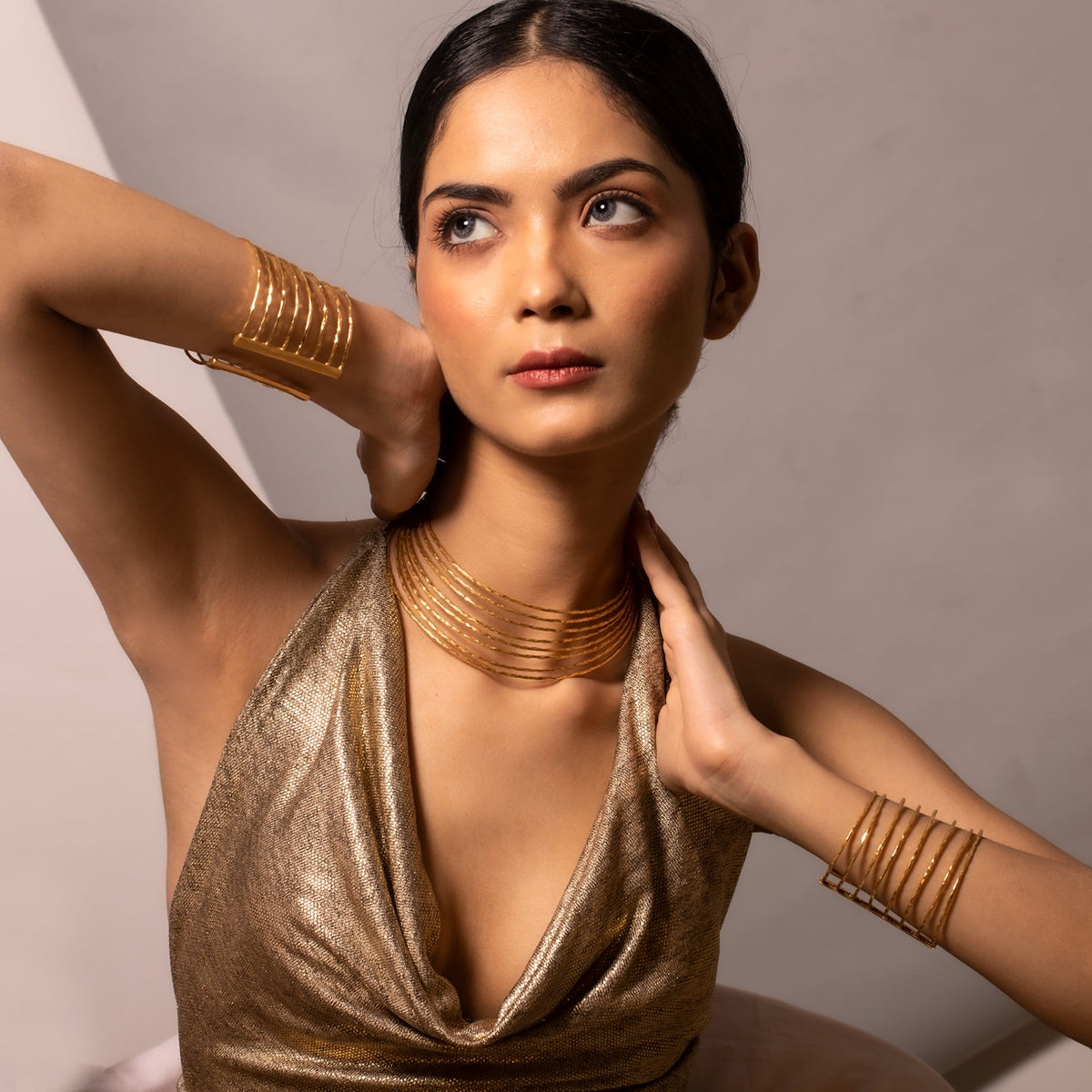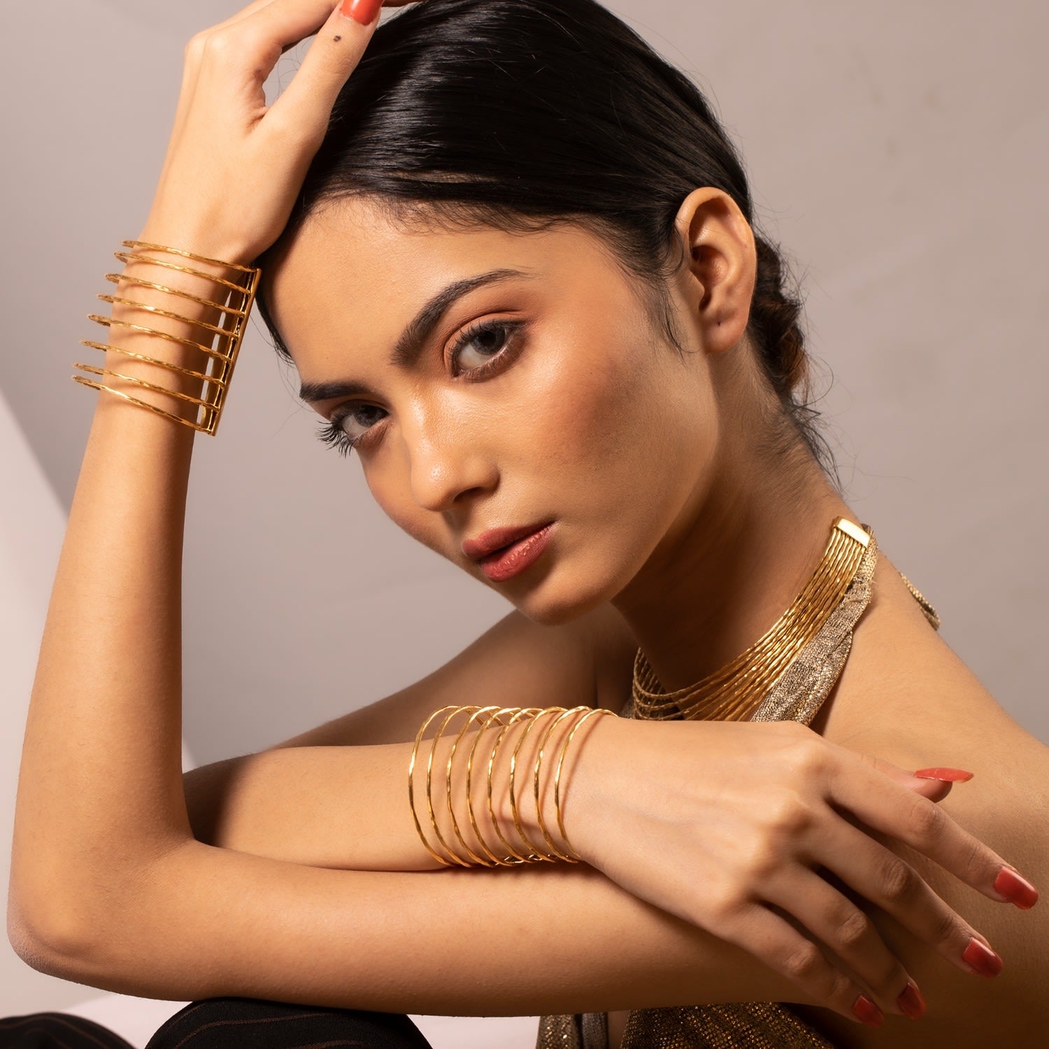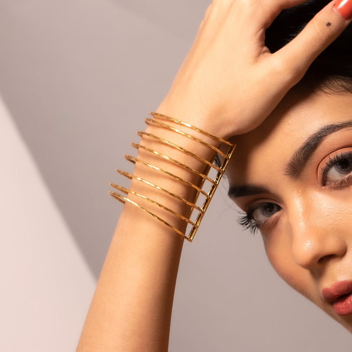 The Gold Cuff by Gem Bazaar Jewellery is a bold statement piece. This wide cuff is made from brass with a thick 2.5-micron layer of 18-karat gold vermeil, ensuring the gold will last a long time. The design features eight individual bands of gold wire held in place by two solid strips. The use of brass instead of silver prevents showing through if the gold wears off over time.