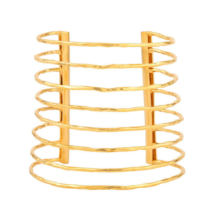 This cuff bracelet is made from brass with a 2.5-micron layer of 18-karat gold vermeil. It is 60mm wide and features eight individual bands of gold wire.