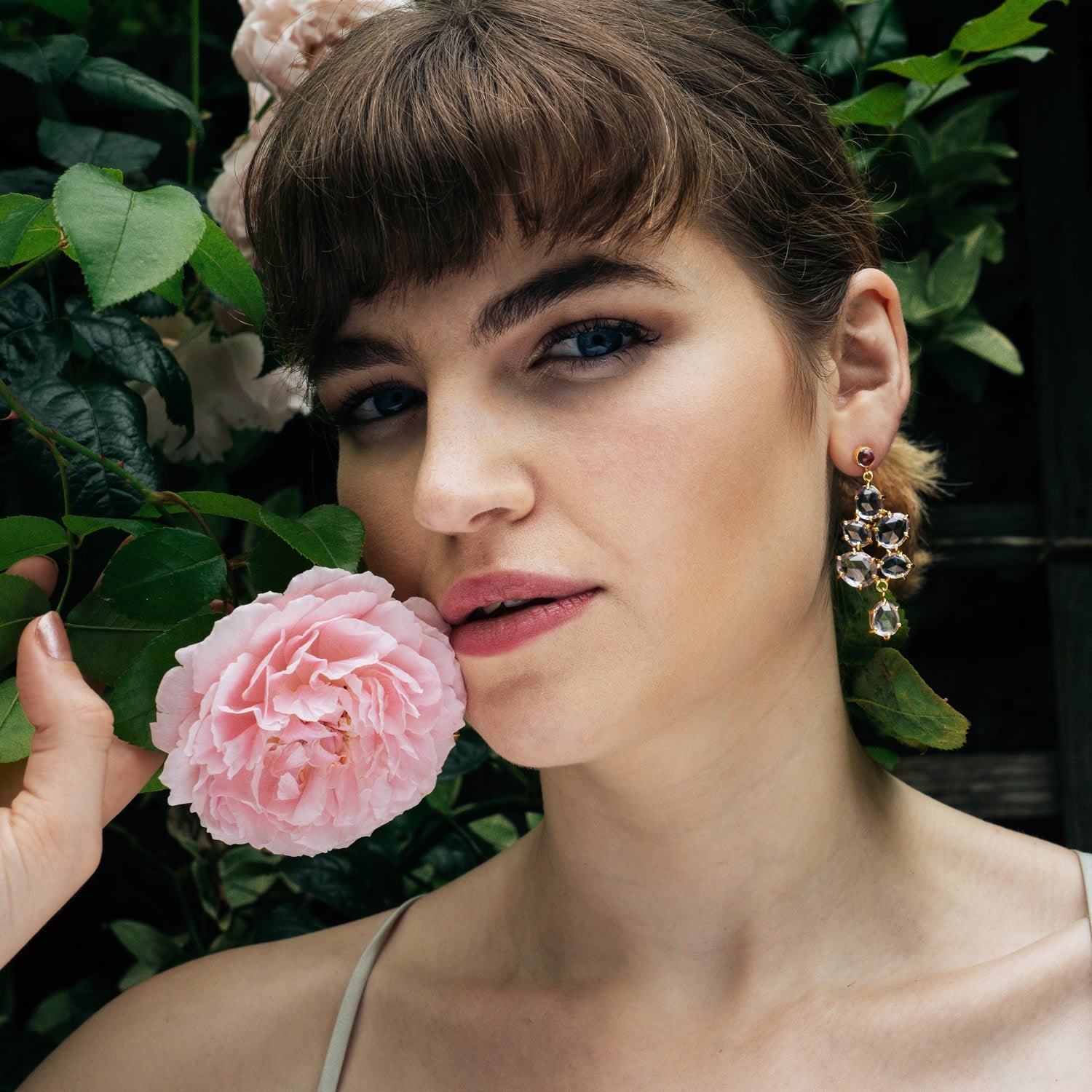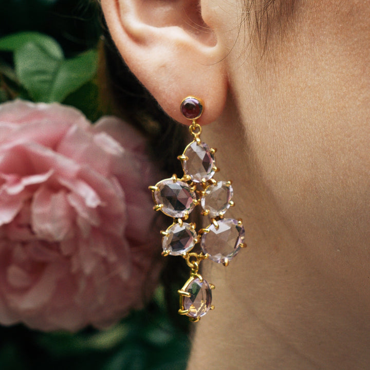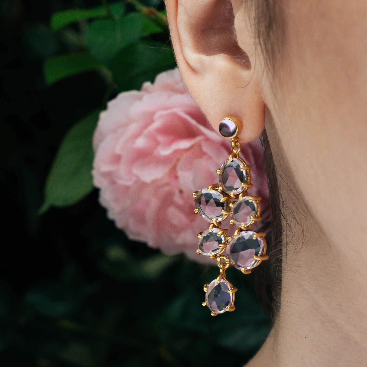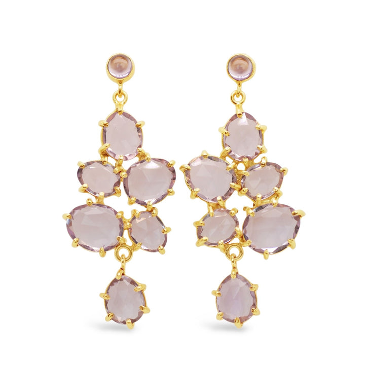 Crafted with a half-micron gold vermeil finish, these earrings feature four faceted rose quartz gemstones, two faceted pink amethyst gemstones, and a small cabochon pink amethyst stud.