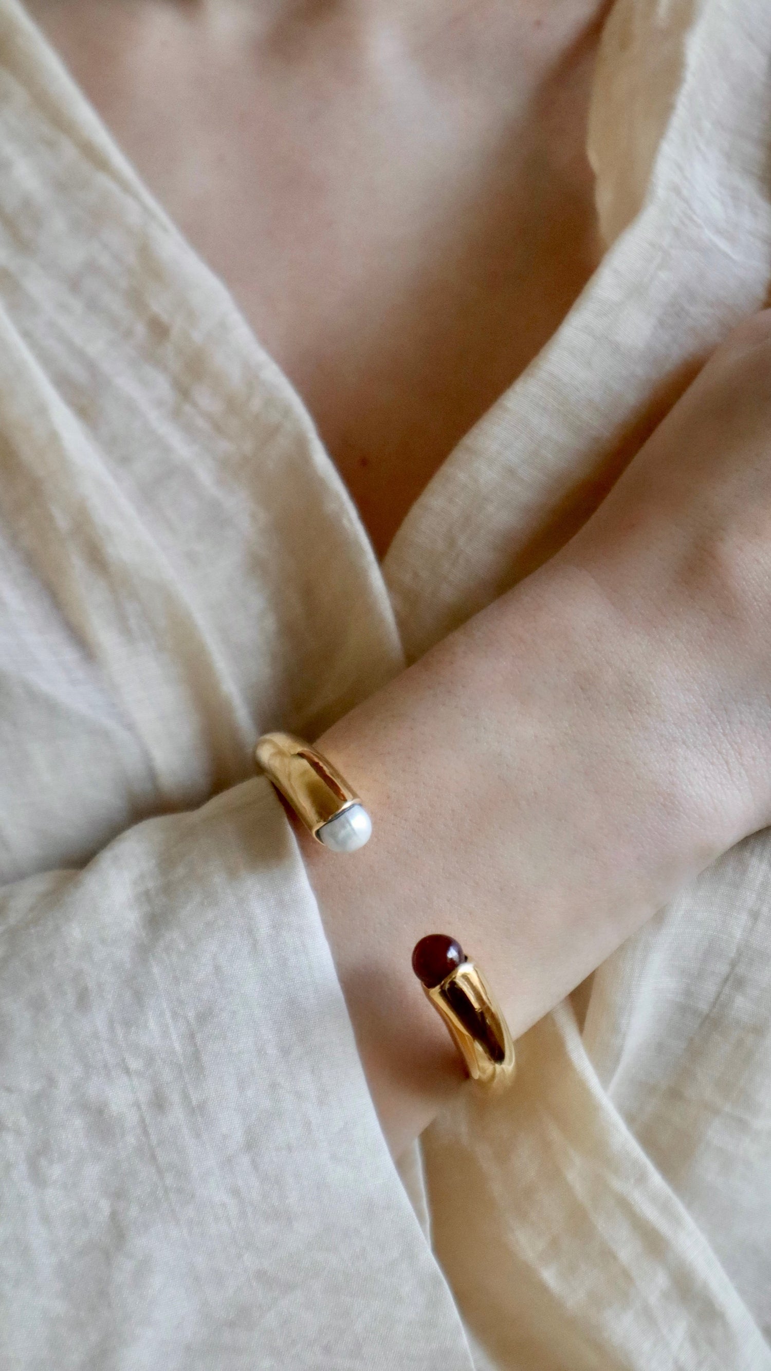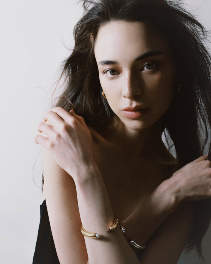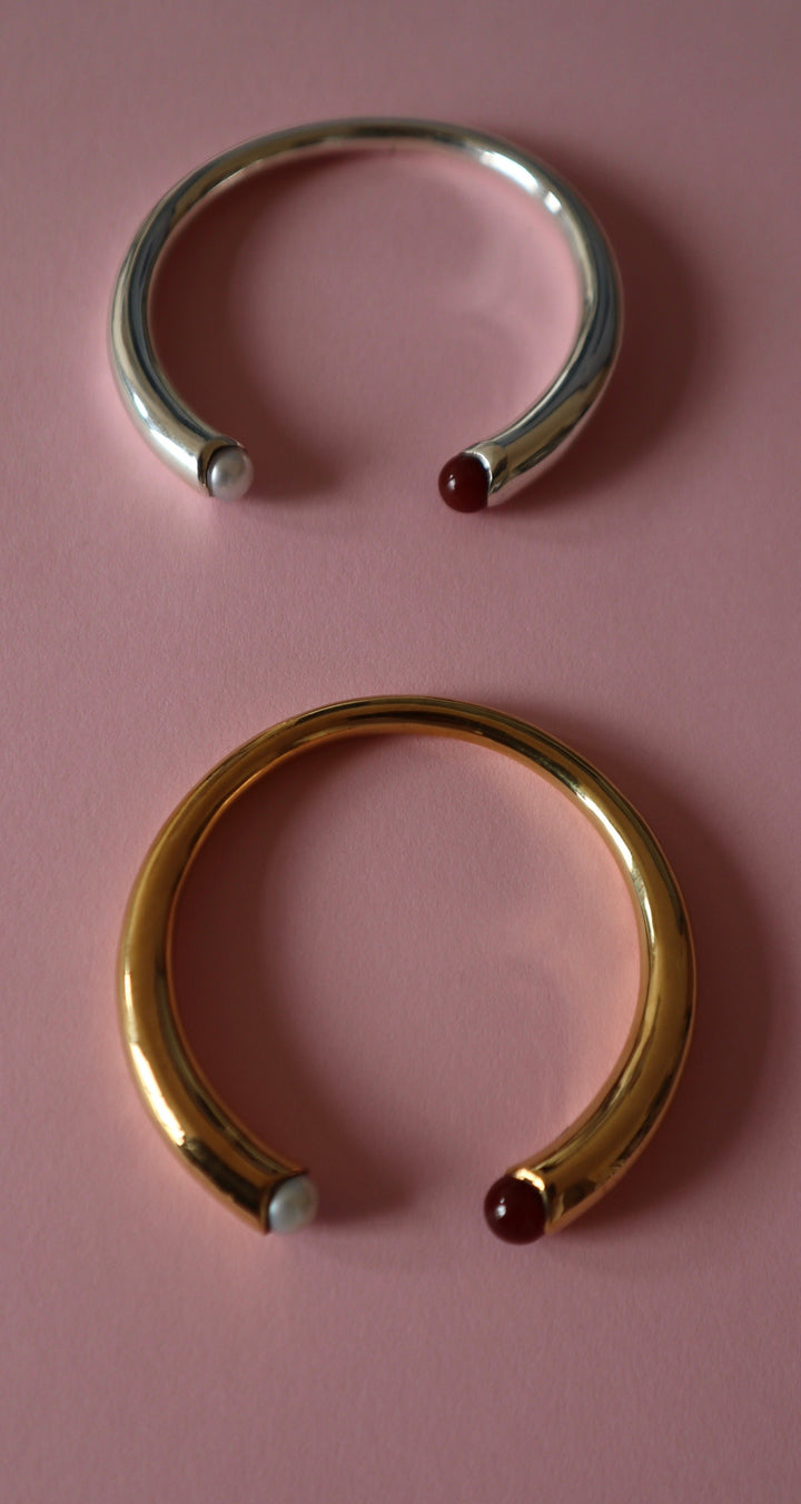 The Teresa Bracelet by Gem Island is a sculptural and unique jewel. This bracelet is adorned with carnelian stones and a baroque pearl, which are believed to stimulate vitality and soften character. The piece is a perfect blend of style and symbolism, with its solar design and calming stones, making it a truly personal accessory.