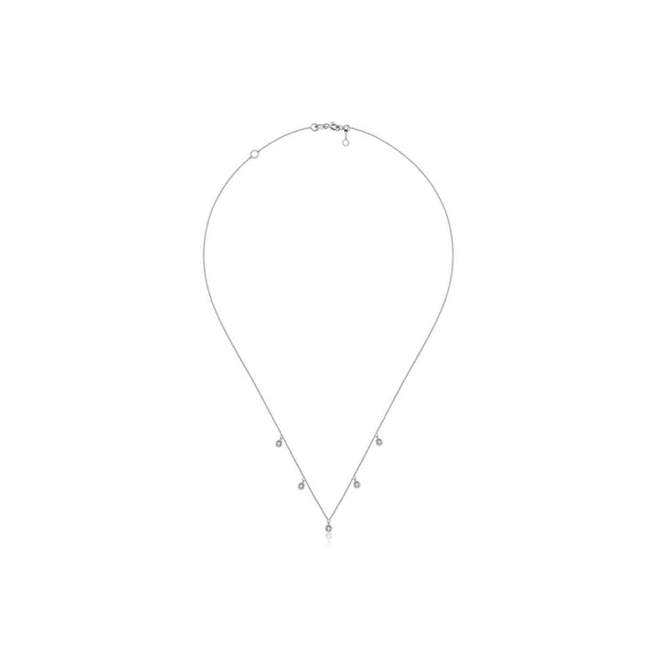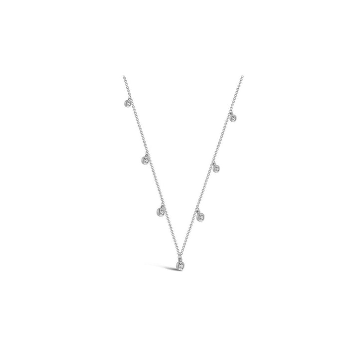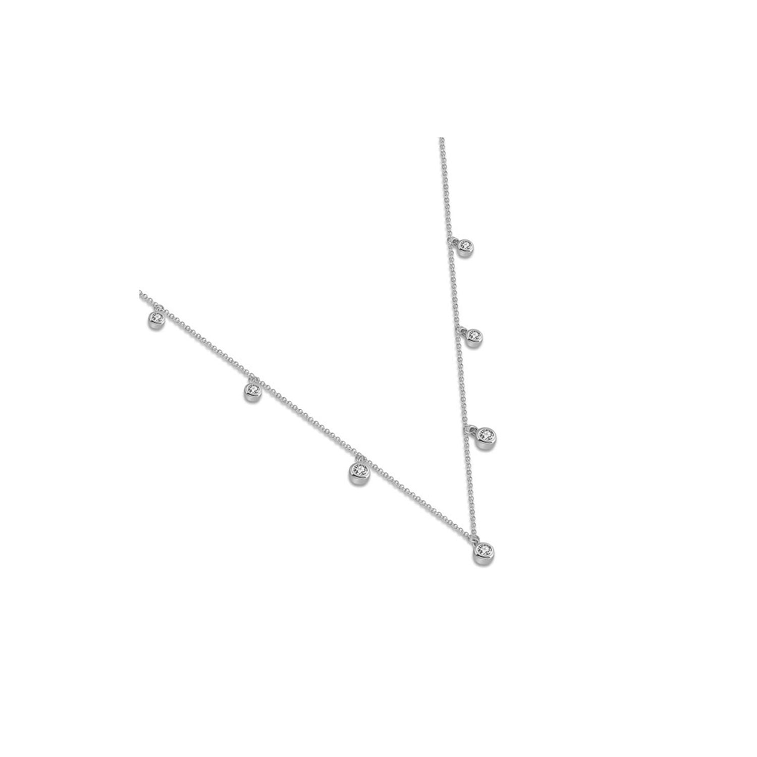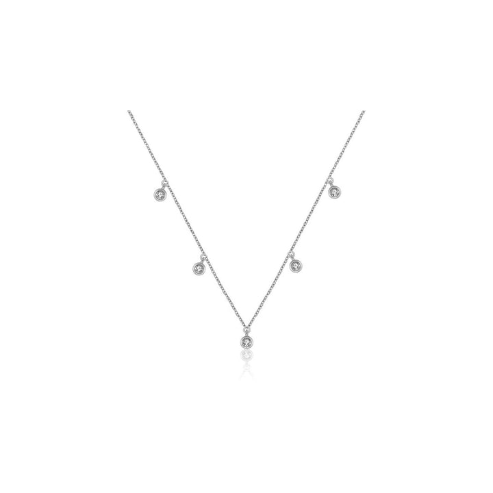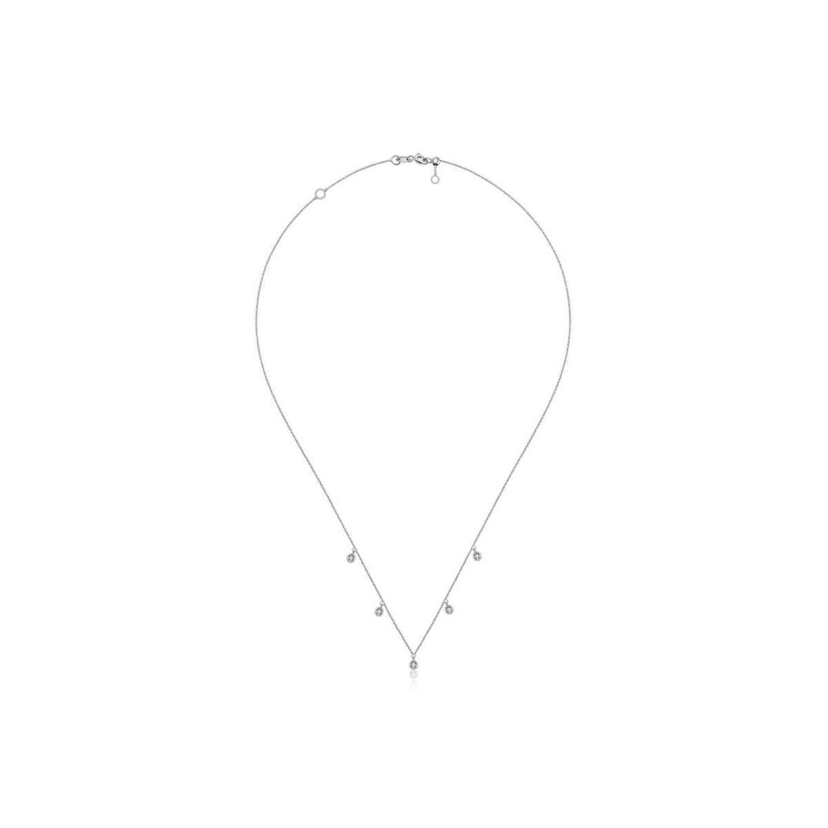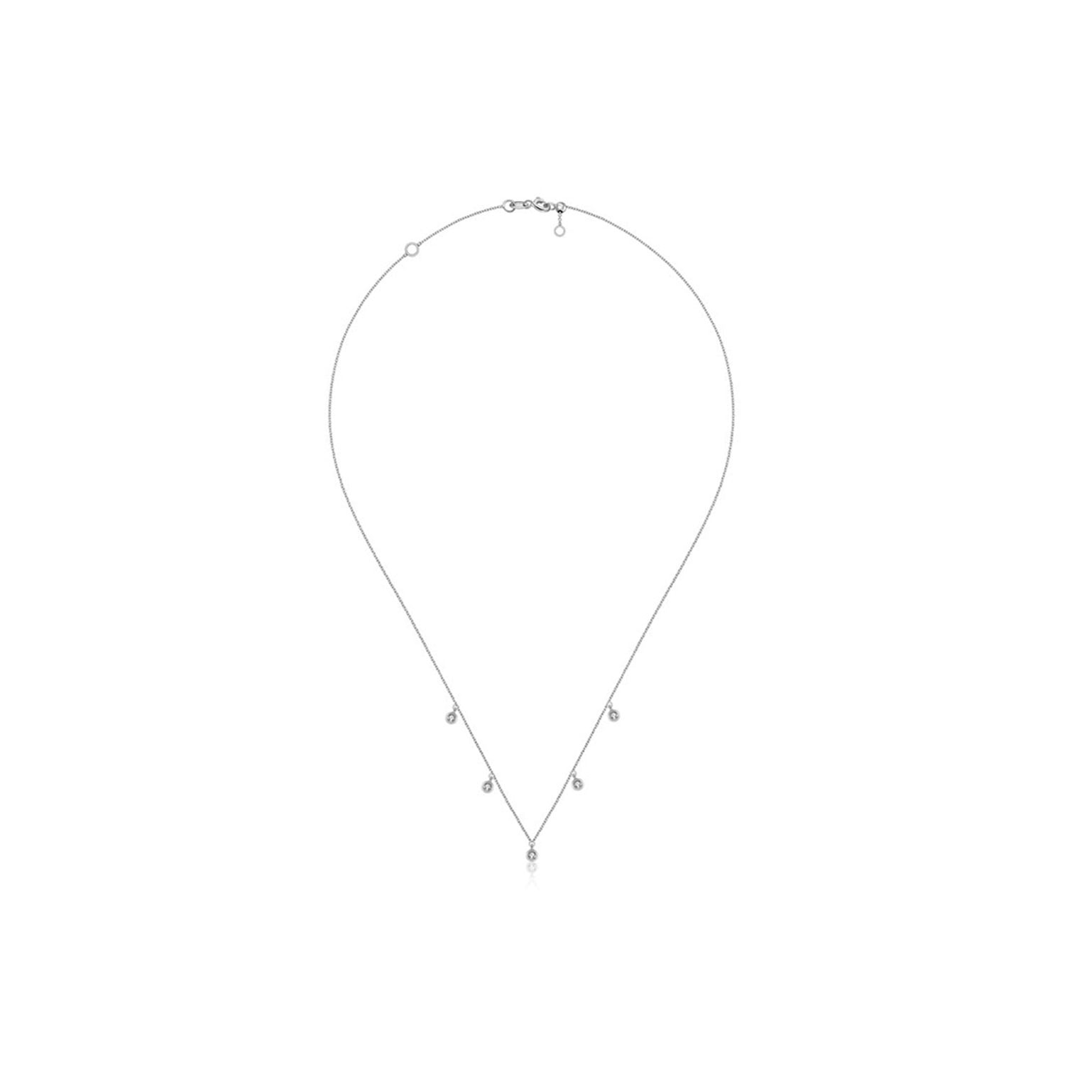 This necklace is crafted from 18k white gold and features five bezel-set diamonds with a total carat weight of 0.15ct. The total gold weight is 2.30g.