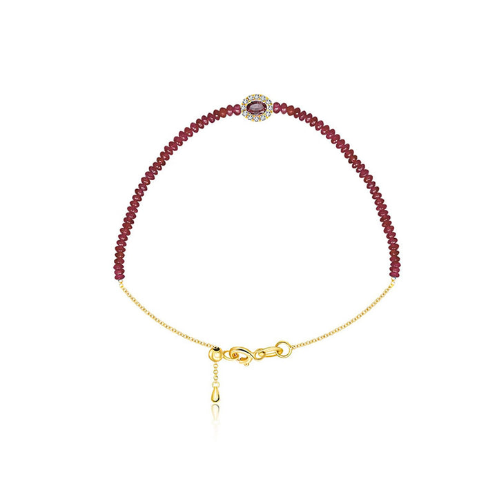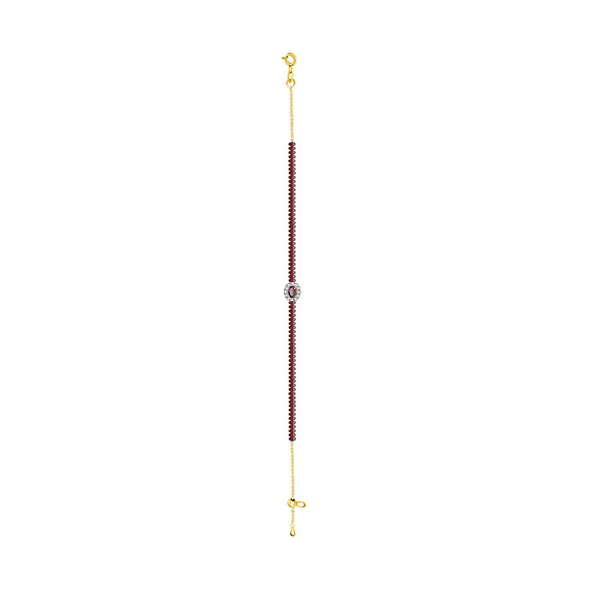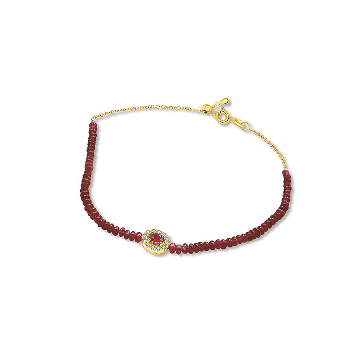 This 18K Yellow Gold Ruby Bead Bracelet by Genevieve Collection is a luxurious and elegant piece. It features ruby stones with a claw setting and bead-style diamonds with a pavé setting. This bracelet is a stunning and timeless accessory that can be worn for any occasion.