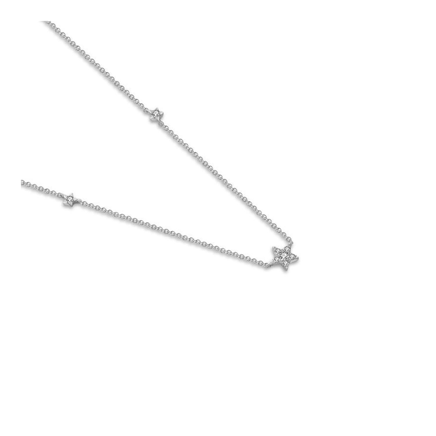 This 18K White Gold Triple Star Shape Diamond Necklace / Choker by Genevieve Collection is a delicate and elegant necklace. It features eight claw-set diamonds in the shape of three stars. This piece is perfect for adding a subtle touch of sparkle and luxury to your look.