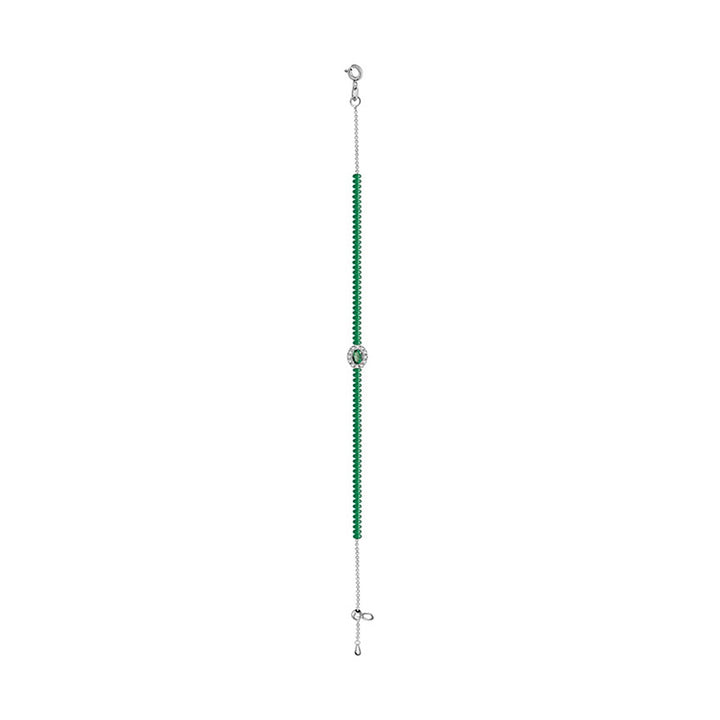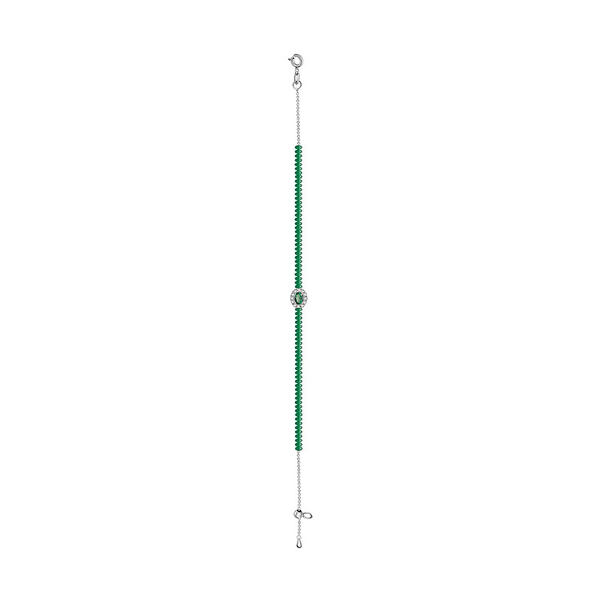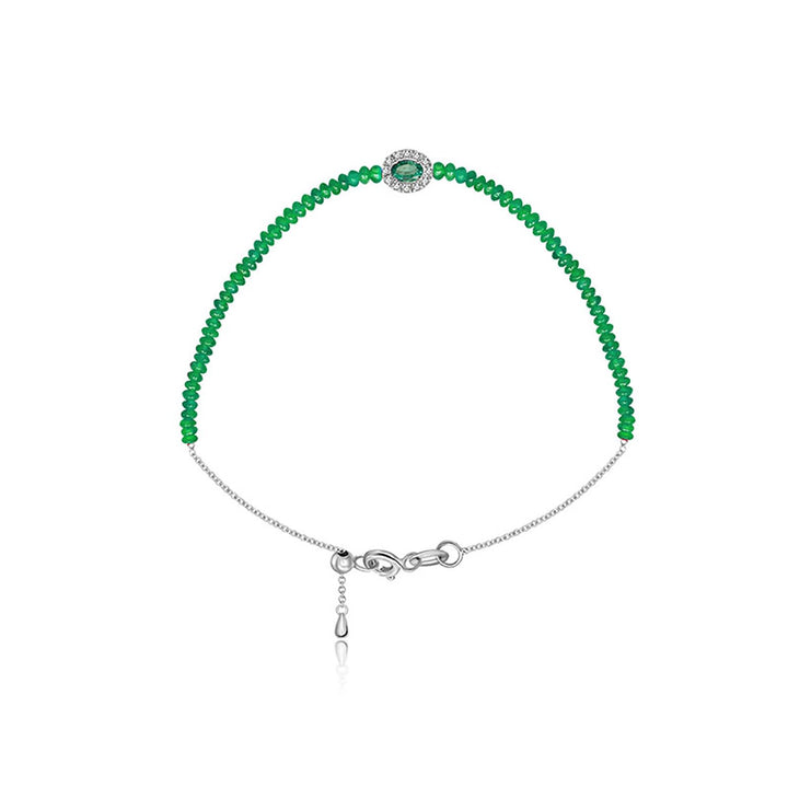 This 18K White Gold Emerald Bead Bracelet by Genevieve Collection is a luxurious and elegant piece. It features emerald stones with a claw setting and bead-style diamonds with a pavé setting. This bracelet is a stunning and timeless accessory that can be worn for any occasion.