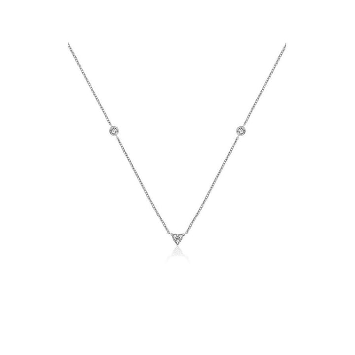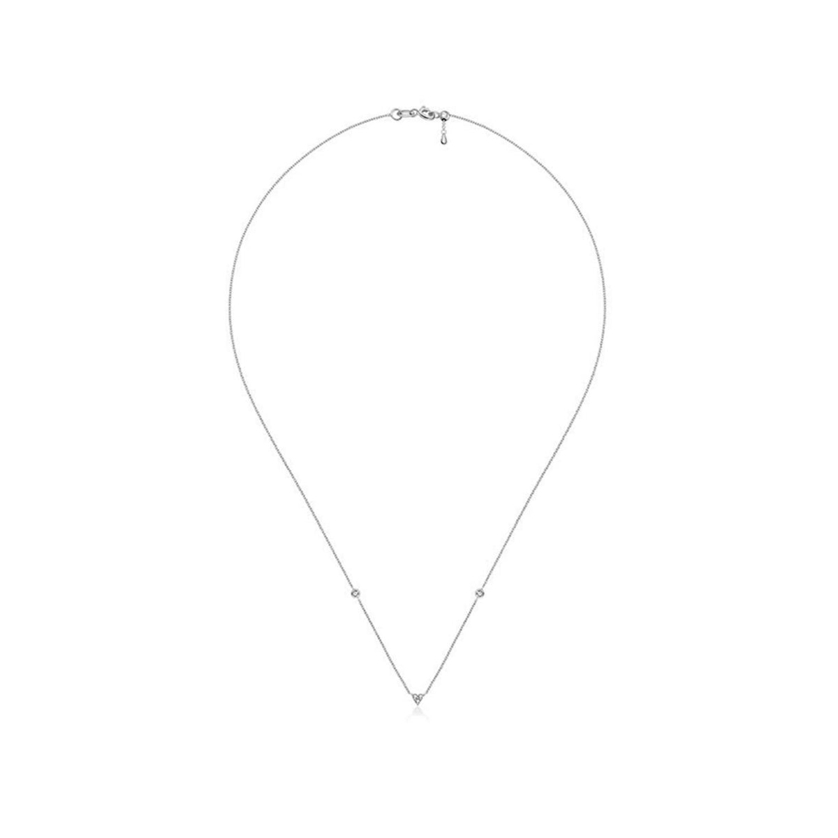 This 18K White Gold Trianlgle Shape Diamond Necklace / Choker by Genevieve Collection is a luxurious and elegant necklace. It features five pavé and bezel-set diamonds in a triangle shape. This choker is perfect for adding a subtle touch of brilliance and sophistication to any outfit.