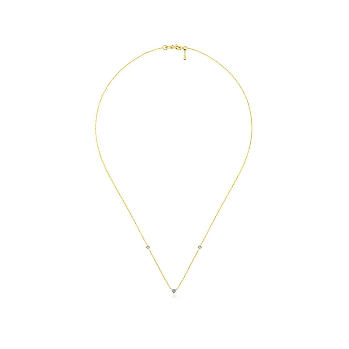 This 18K Yellow Gold Trianlgle Shape Diamond Necklace / Choker by Genevieve Collection is a luxurious and elegant necklace. It features five pavé and bezel-set diamonds in a triangle shape. This choker is perfect for adding a subtle touch of brilliance and sophistication to any outfit.