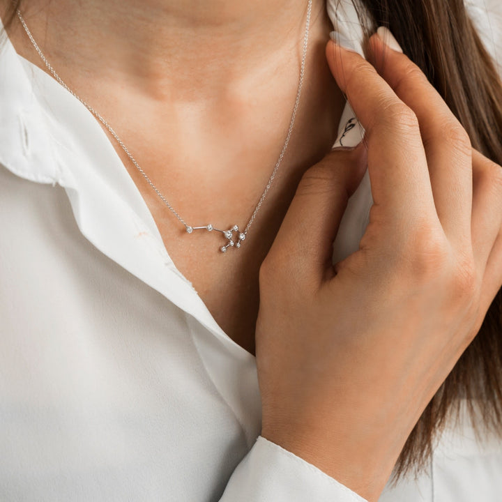 This Leo Zodiac Constellation Necklace by Genevieve Collection is the perfect gift for the confident and passionate Leo. The elegant constellation is crafted with eight sparkling diamonds and set in solid 18k yellow gold. This necklace is a simple yet luxurious piece that celebrates your zodiac sign with timeless beauty and is perfect for adding a personal and sophisticated touch to your outfit.