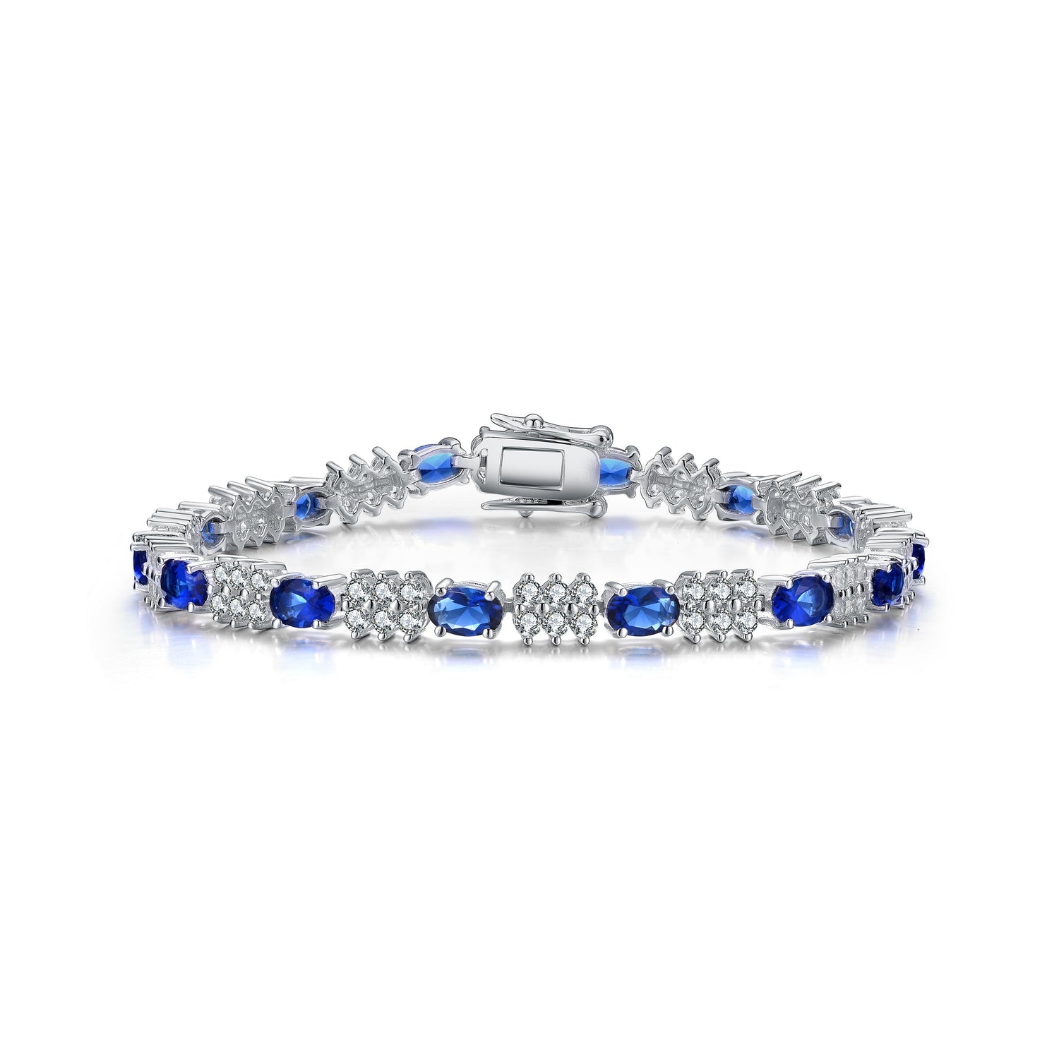 This tennis bracelet is crafted from white gold-plated material.