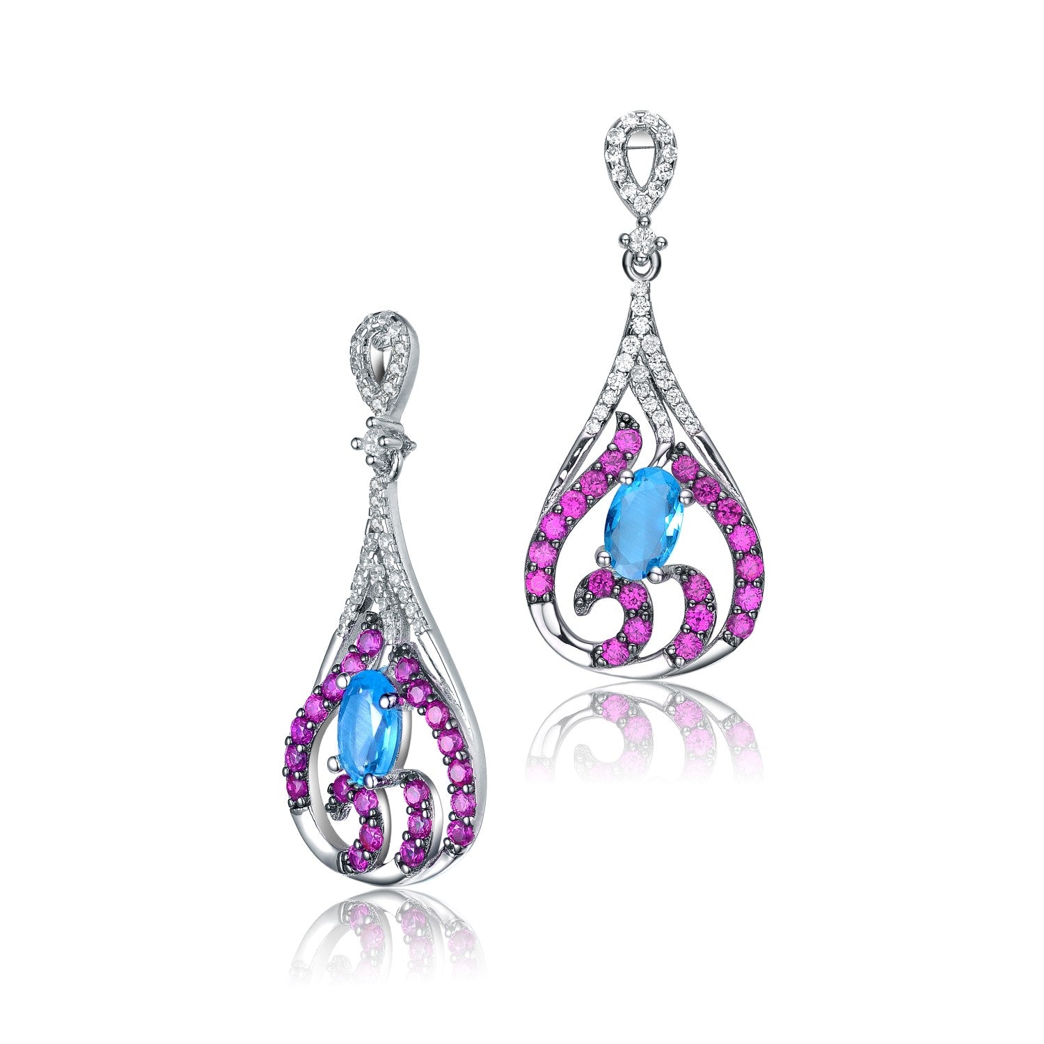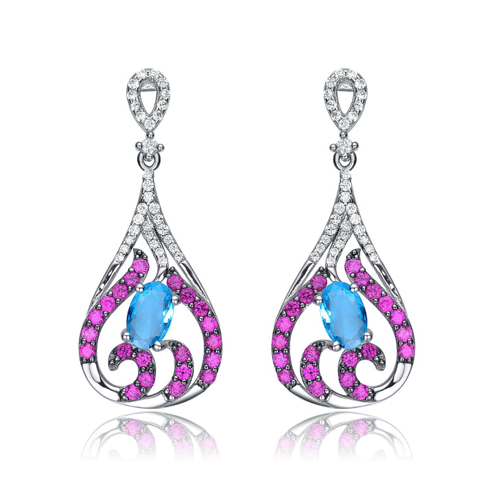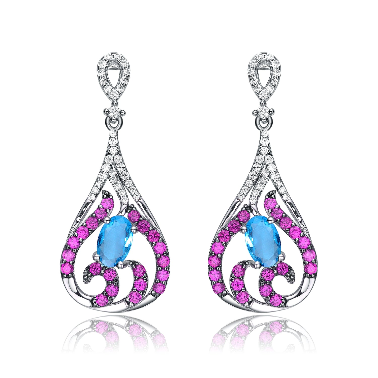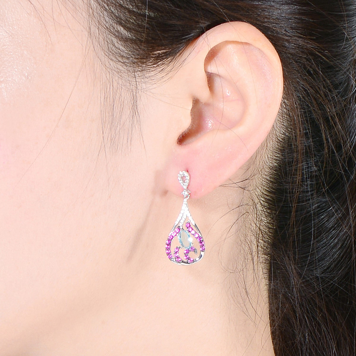 These dangle earrings are crafted from sterling silver with purple and blue cubic zirconia stones.
