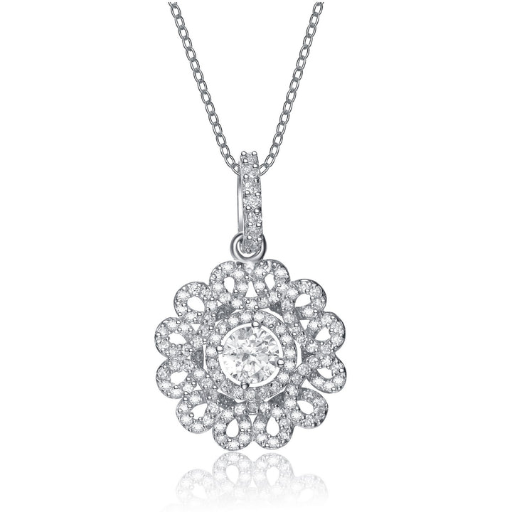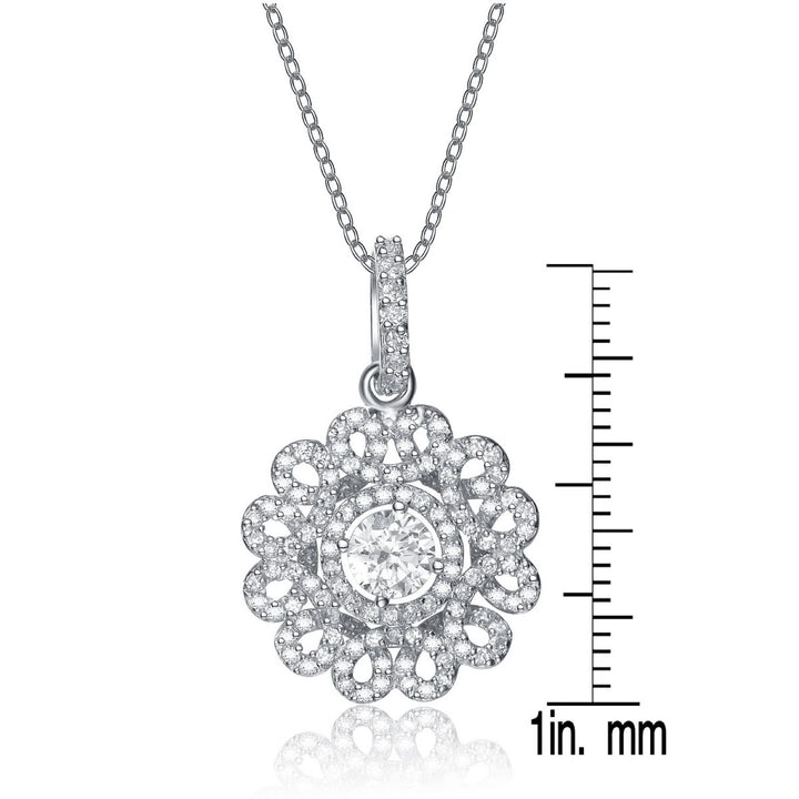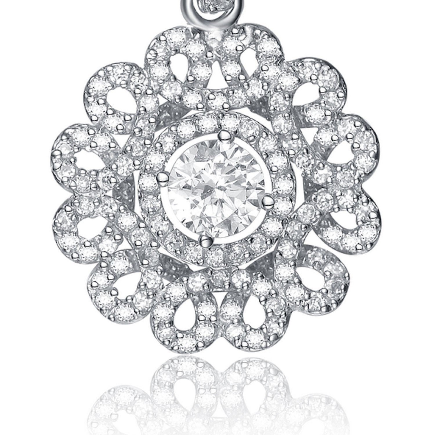 This Sterling Silver White Cubic Zirconia Flower Pendant by Genevive Jewelry is a beautiful and elegant accessory. This floral pendant showcases intricate detailing in sterling silver and white cubic zirconia and would make a great gift.