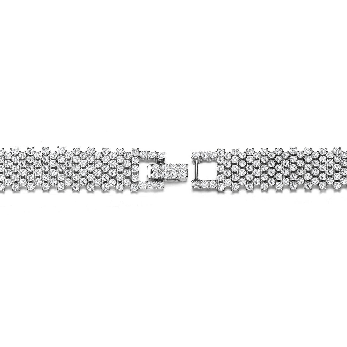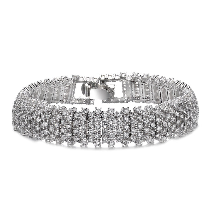 This link bracelet is crafted from white gold plating, features clear round brilliant simulated diamonds, and is secured with a box clasp.