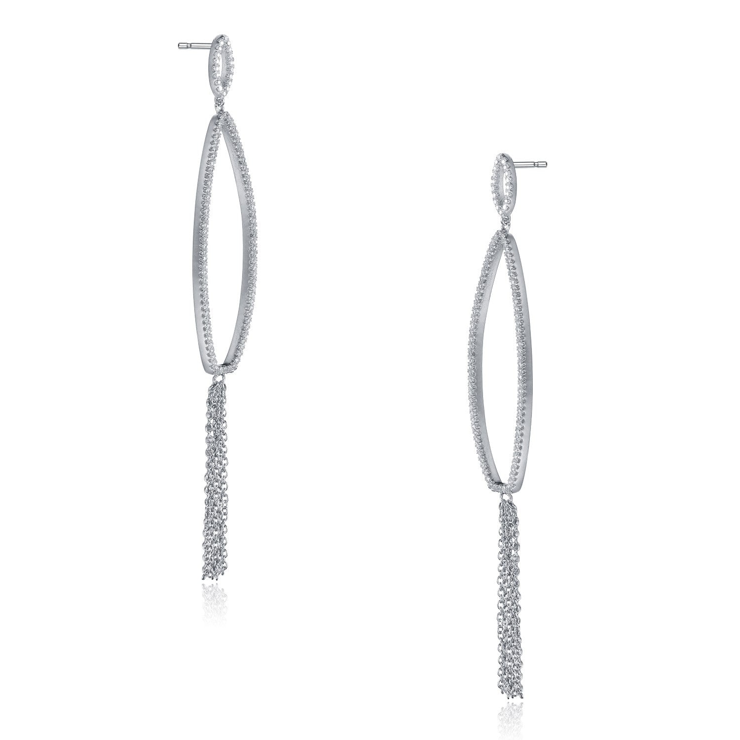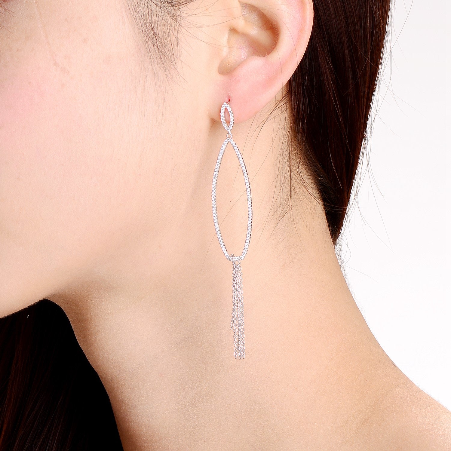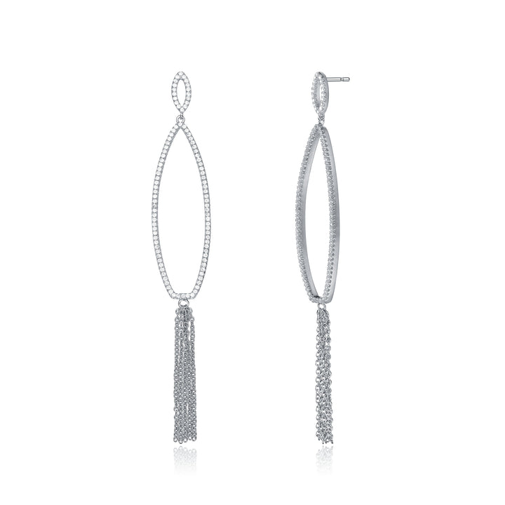 These dangle earrings are crafted from .925 sterling silver with rhodium plating and feature cubic zirconia stones. They have a tassel and an open oval shape.
