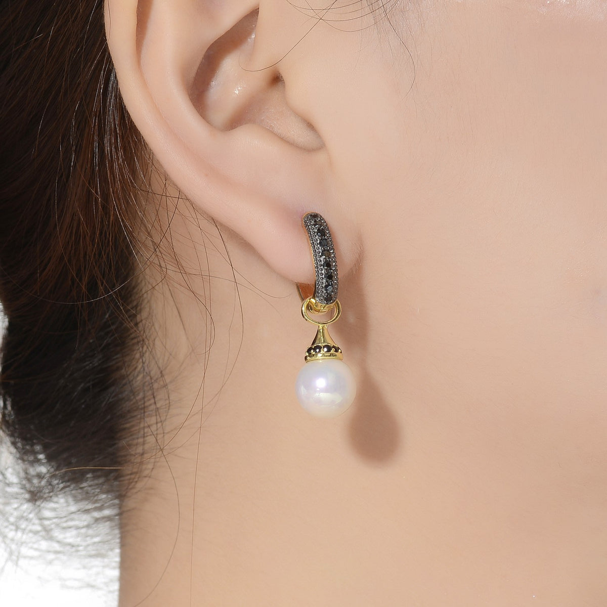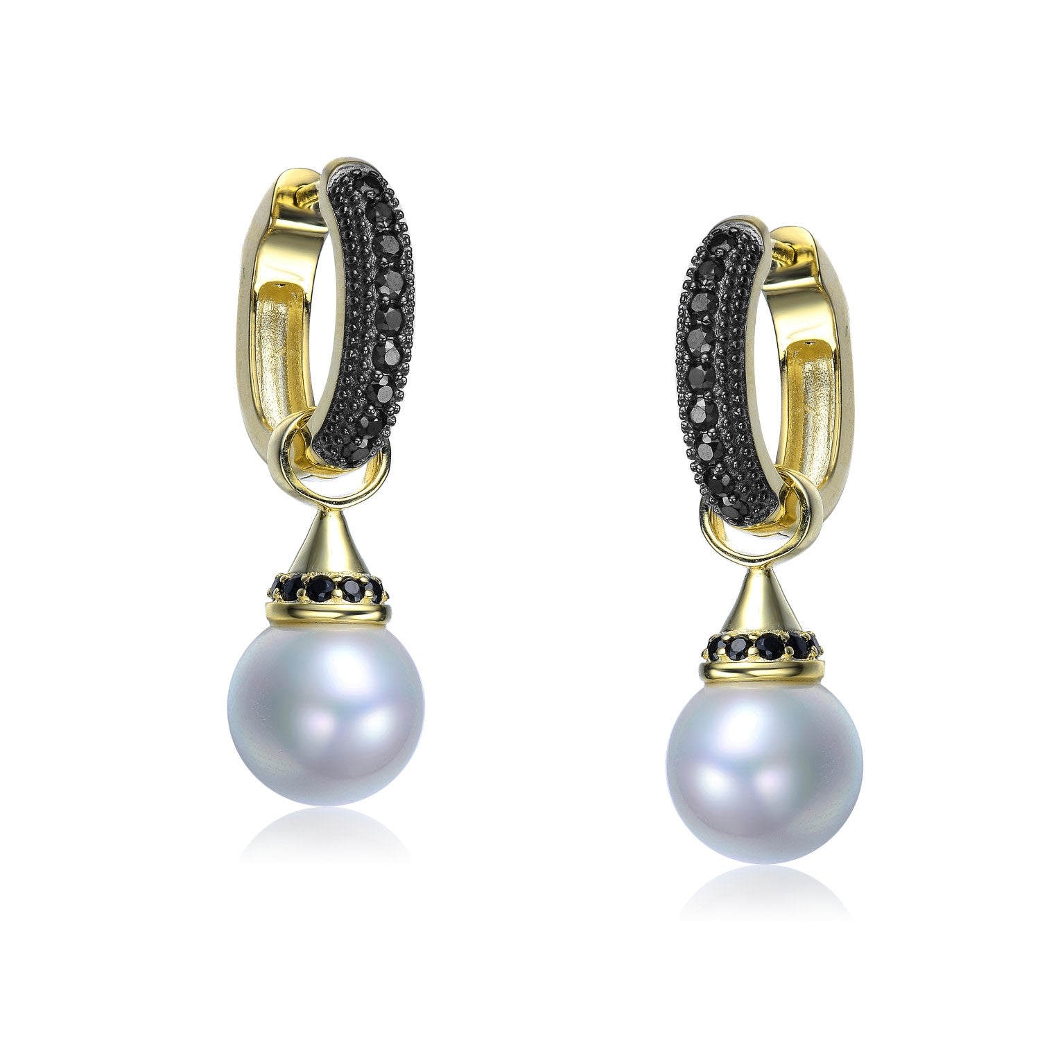 These pearl earrings are crafted from .925 sterling silver with yellow gold plating. They feature a white cultured pearl and black cubic zirconia gemstones.