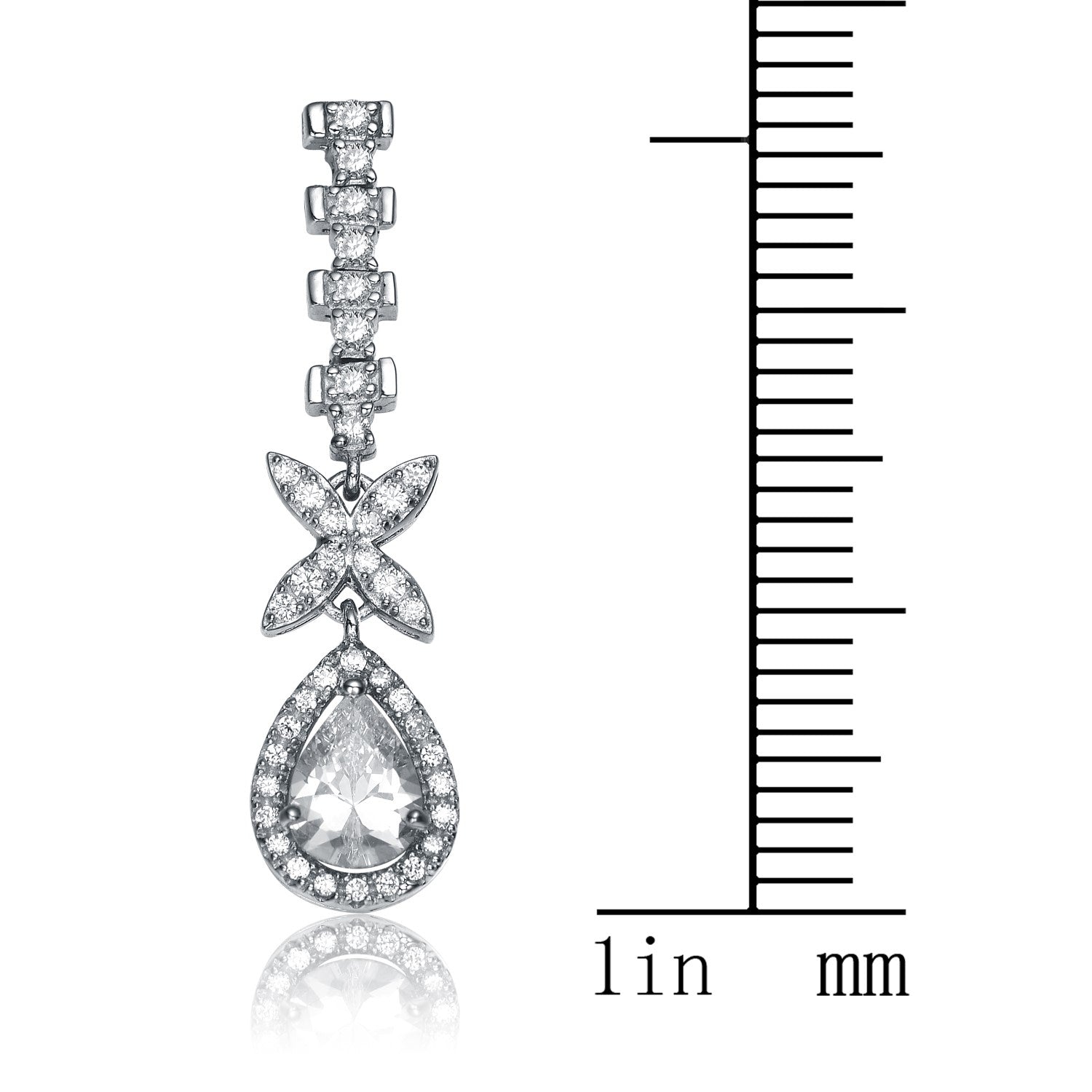 These dangle earrings are crafted from sterling silver with rhodium plating and feature a pear-shaped cubic zirconia solitaire with a halo of smaller cubic zirconias.