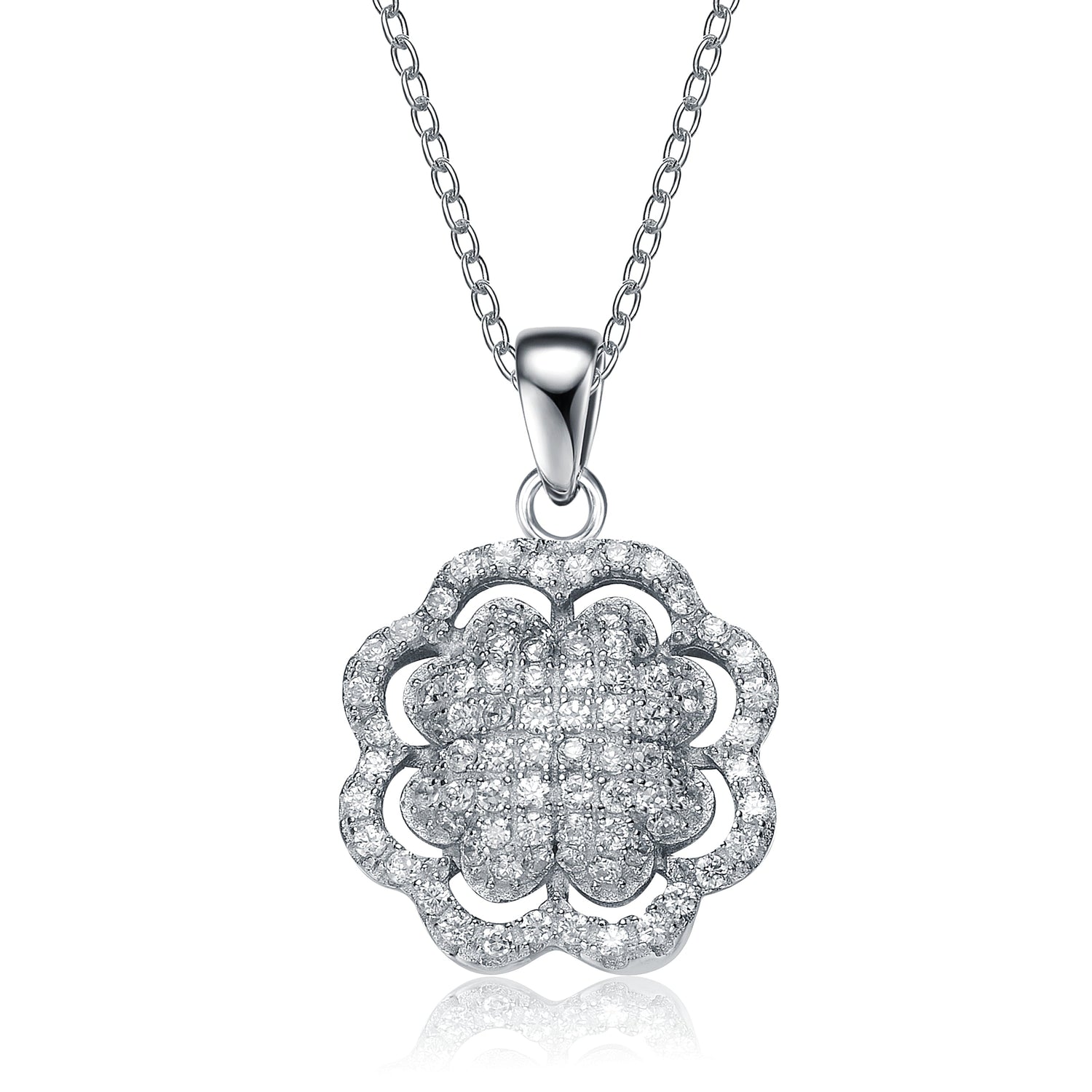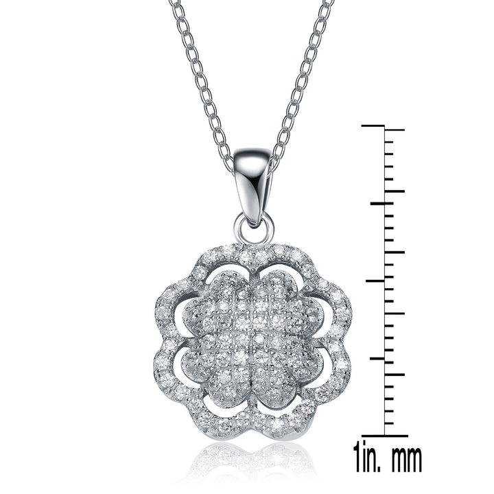 This Sterling Silver White Cubic Zirconia Flower Shape Pendant by Genevive Jewelry is a stunning and elegant accessory. The Tudor rose-like design, adorned with white cubic zirconia, creates a beautiful and sophisticated floral look. This pendant is the perfect accessory for any event, adding a touch of sparkling elegance to your style.