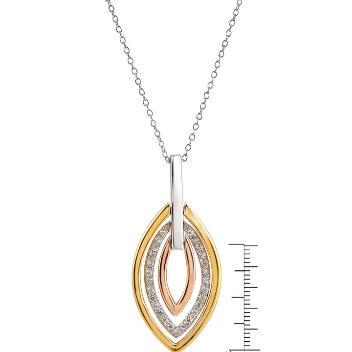 This pendant necklace is crafted from .925 sterling silver with rhodium, gold, and rose gold platings and features cubic zirconia.