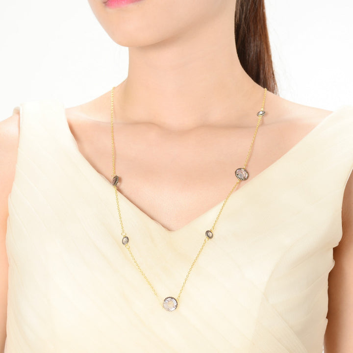 This long necklace is crafted from .925 sterling silver with gold plating and features clear cubic zirconia stones outlined in black.