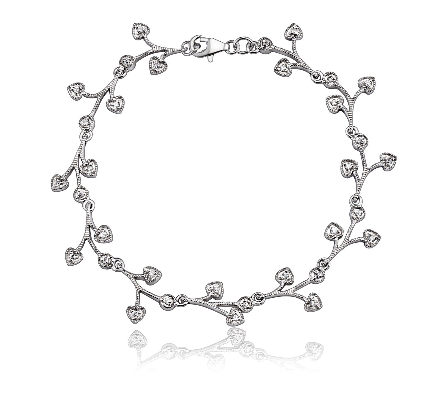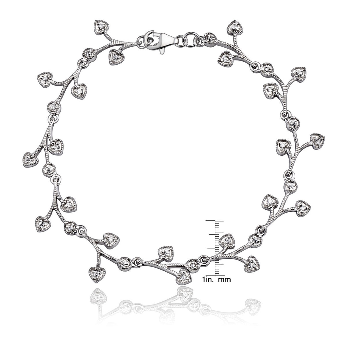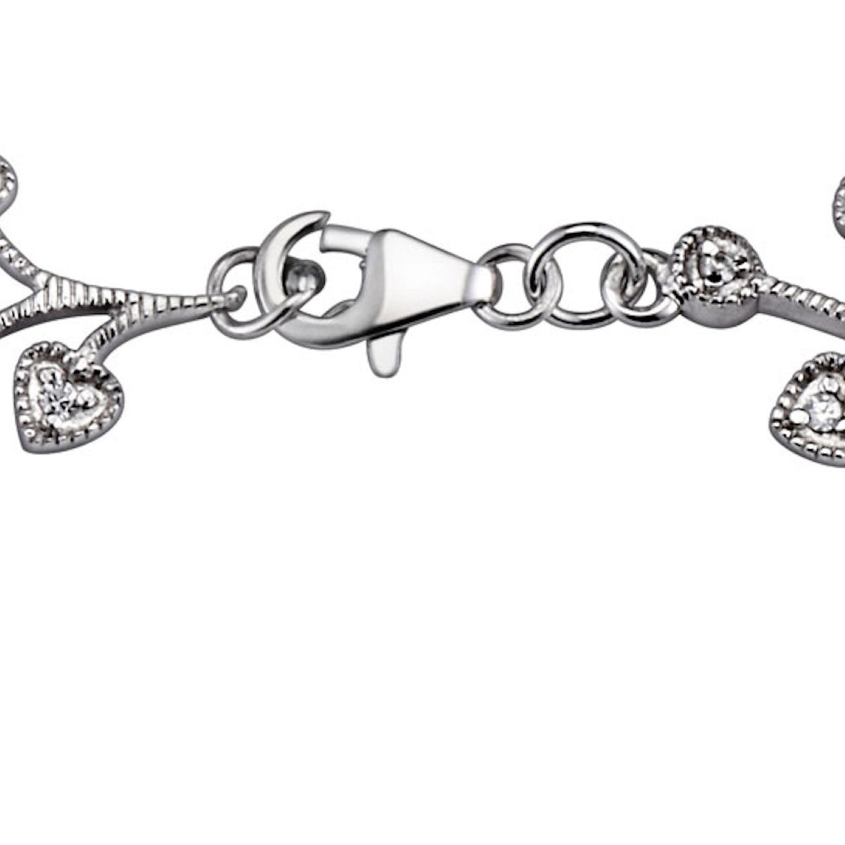 This bracelet is crafted from sterling silver with white gold plating and is set with clear cubic zirconia. It has heart-shaped accents.