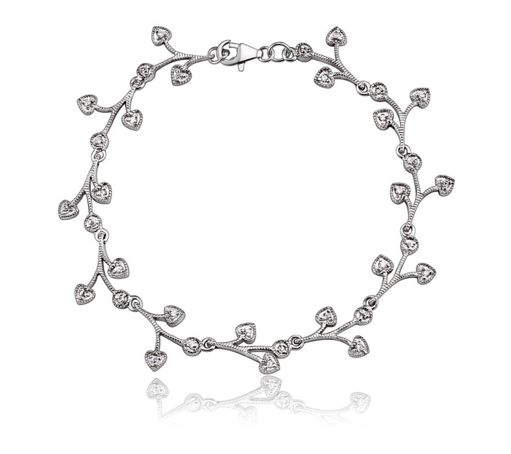 This Sterling Silver White Gold Plated With Clear Cubic Zirconia Bracelet With Dangling Pieces by Genevive Jewelry Jewelry is an elegant and dazzling accessory. The design, reminiscent of a gently curving vine, features numerous thin pieces of metal with heart-shaped accents. The clear cubic zirconia stones add a brilliant sparkle, making this bracelet a romantic and sophisticated piece.