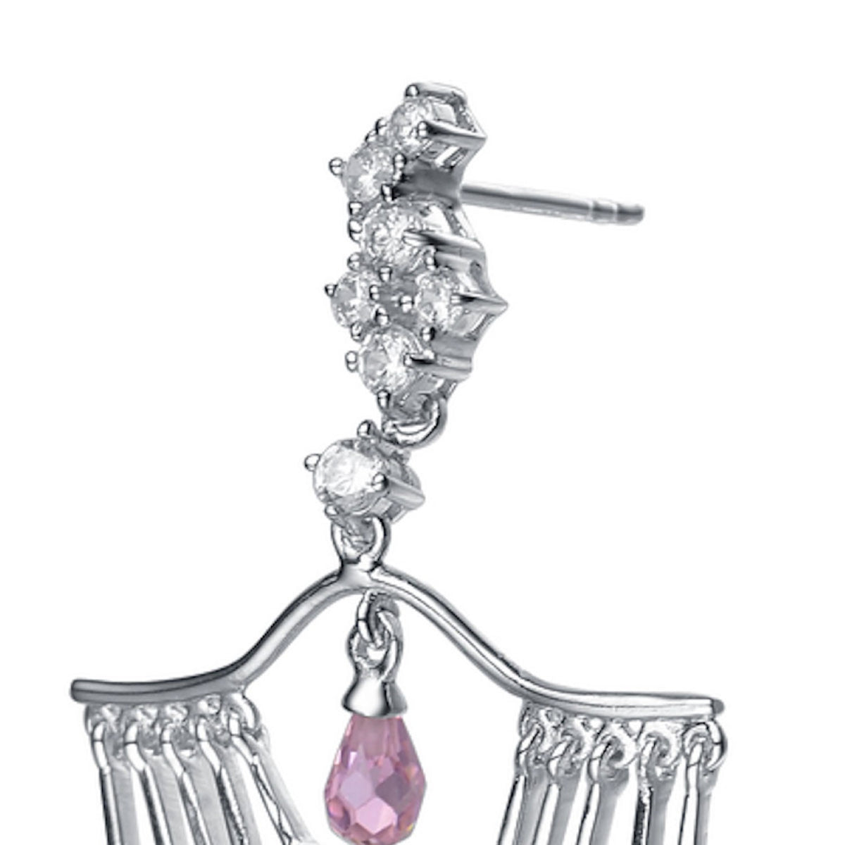 These chandelier earrings are crafted from sterling silver with white gold plating and are set with clear cubic zirconia stones.