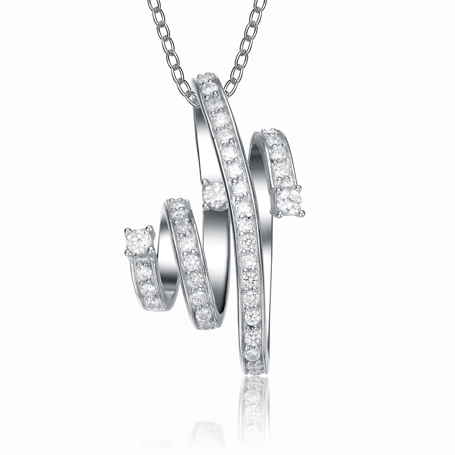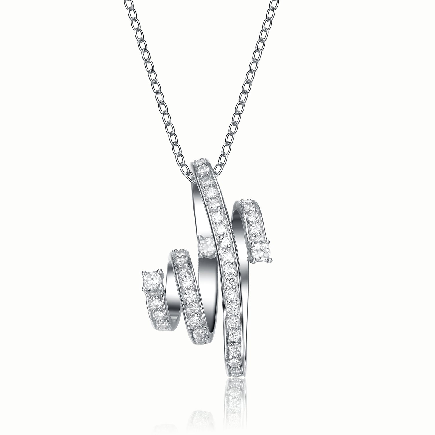 This pendant necklace is crafted from sterling silver and features a twirl pattern with clear cubic zirconia stones.