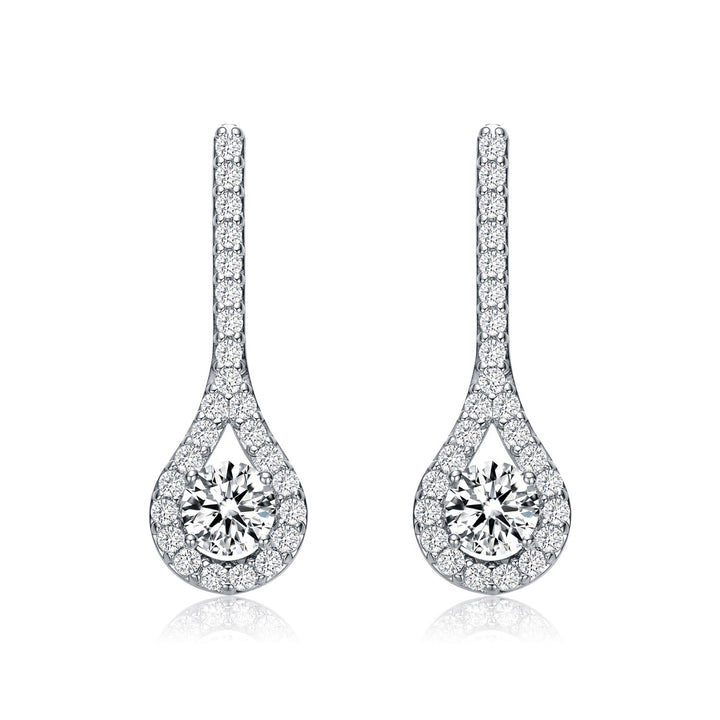 These Sterling Silver Cubic Zirconia Solitaire Teardrop Earrings by Genevive Jewelry are a fine and elegant accessory. The dangling teardrop frame features a clear round cubic zirconia solitaire outlined with smaller cubic zirconia stones. Crafted from rhodium-plated sterling silver, these earrings add a touch of sparkle and luxury to your outfit.