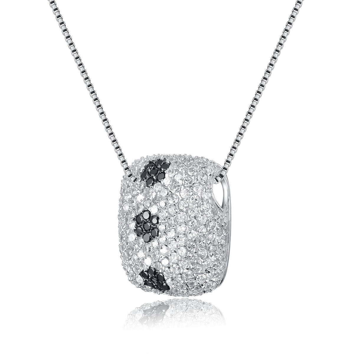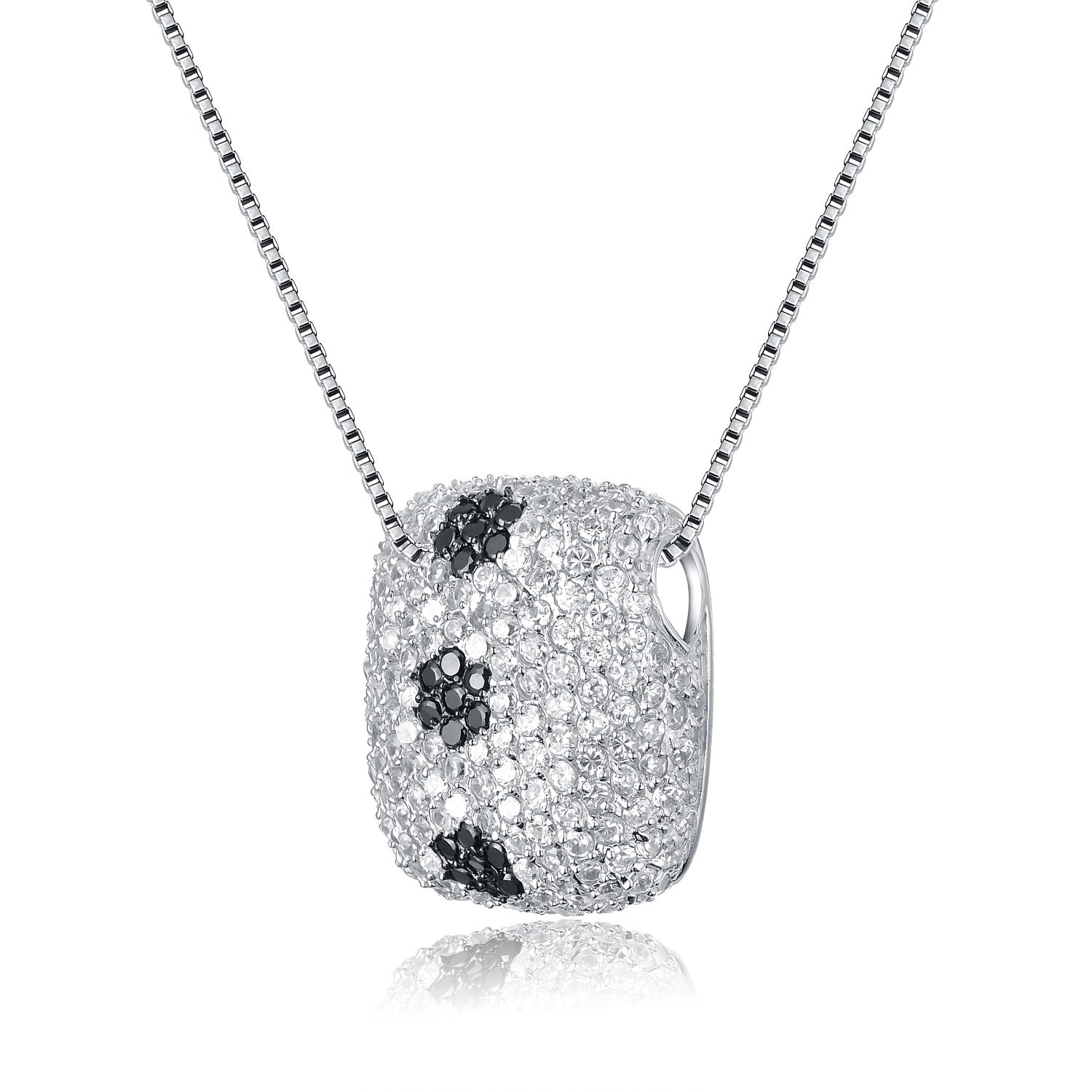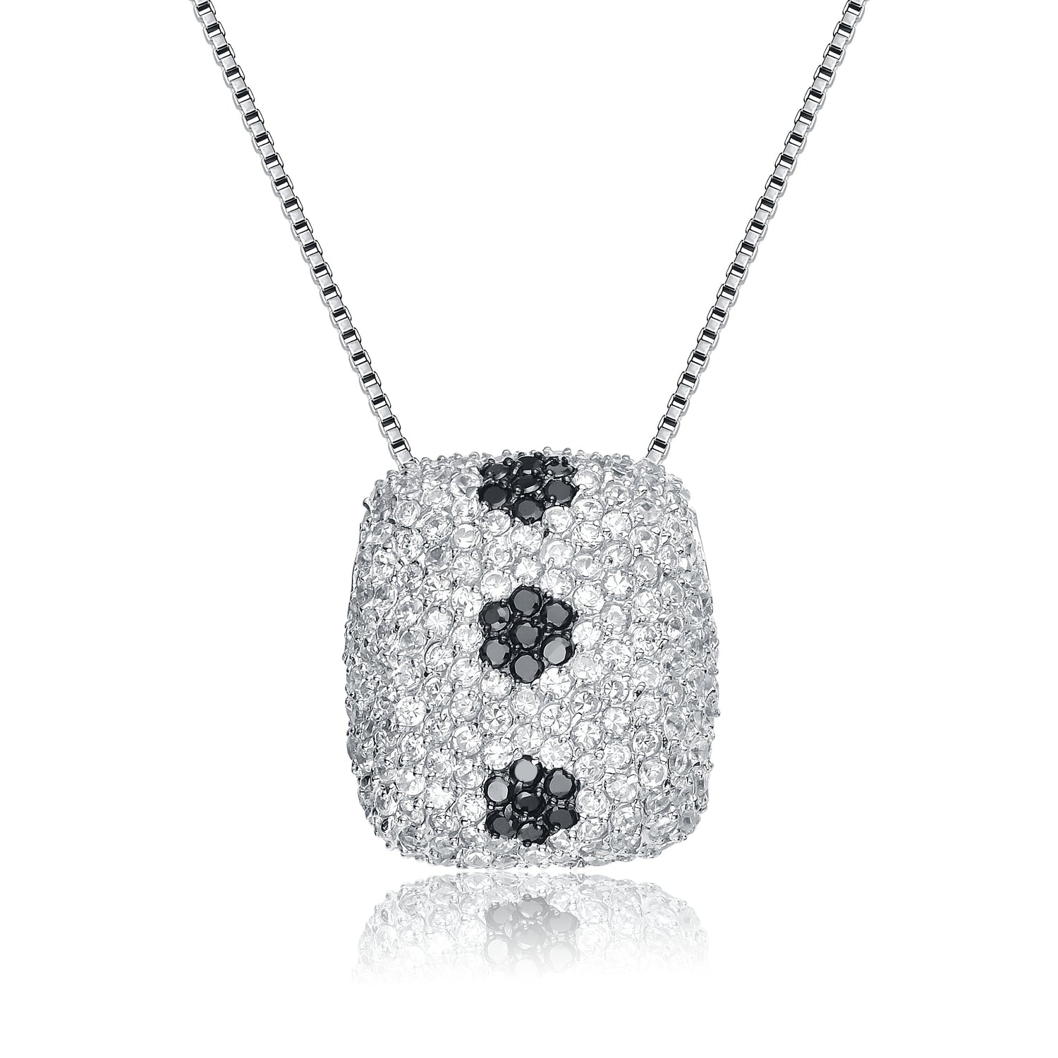 This pendant necklace is crafted from sterling silver and is set with clear pave cubic zirconia stones accented with black cubic zirconias.