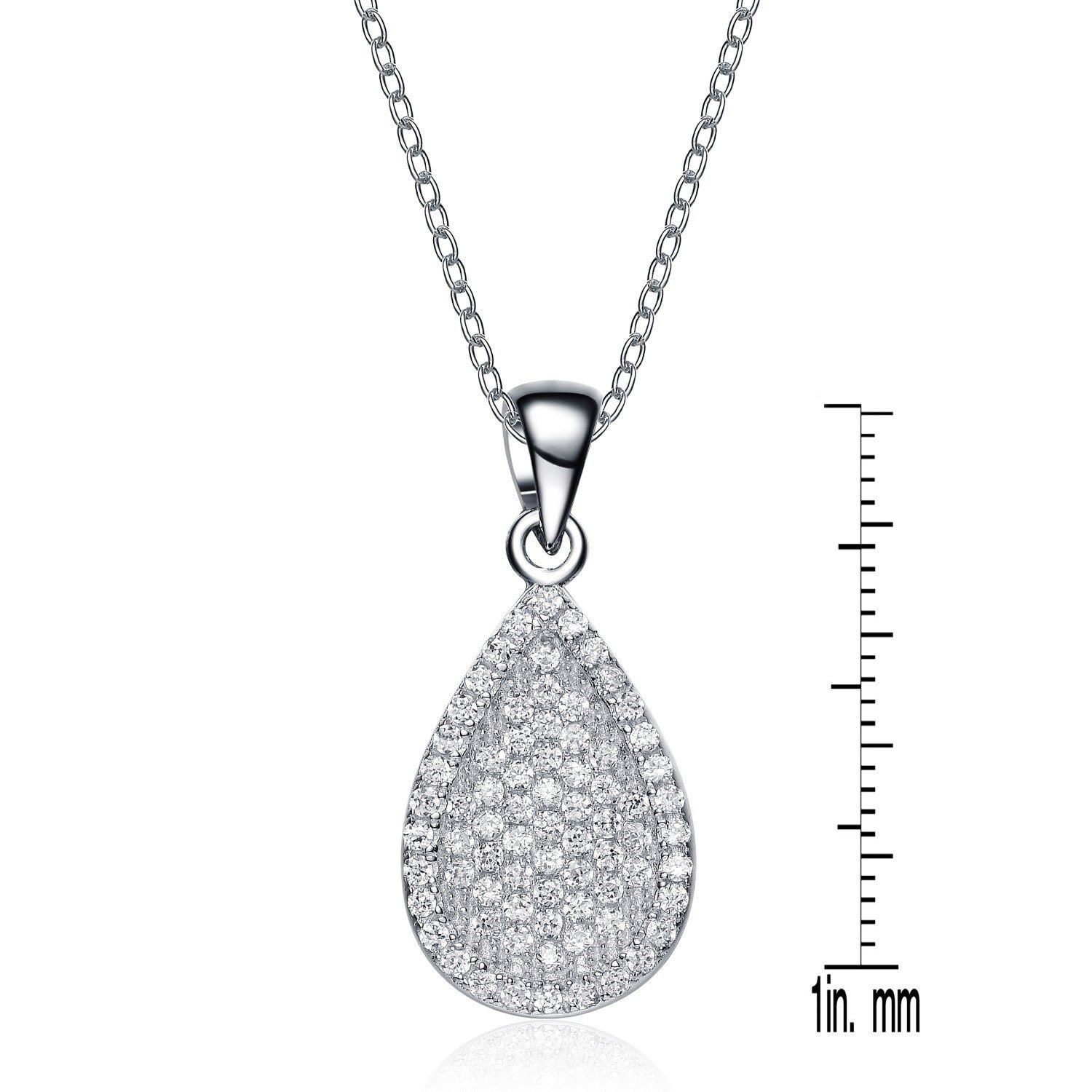 This pendant is crafted from sterling silver with white gold plating and is set with brilliant white cubic zirconia stones in a pave setting.