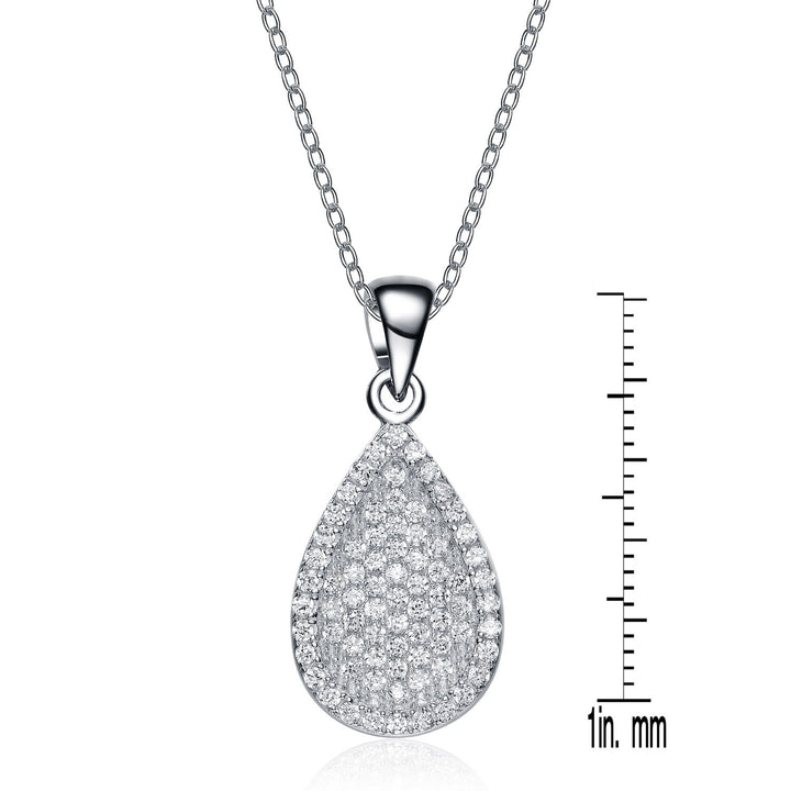 This Sterling Silver White Gold Plated With Clear Cubic Zirconia Pear Drop Pendant by Genevive Jewelry is a charming and alluring accessory. The pendant features a brilliant pear drop of multiple white cubic zirconia stones in a pave setting, dangling from a sterling silver loop. This piece will leave you breathless and looks great with any dress.