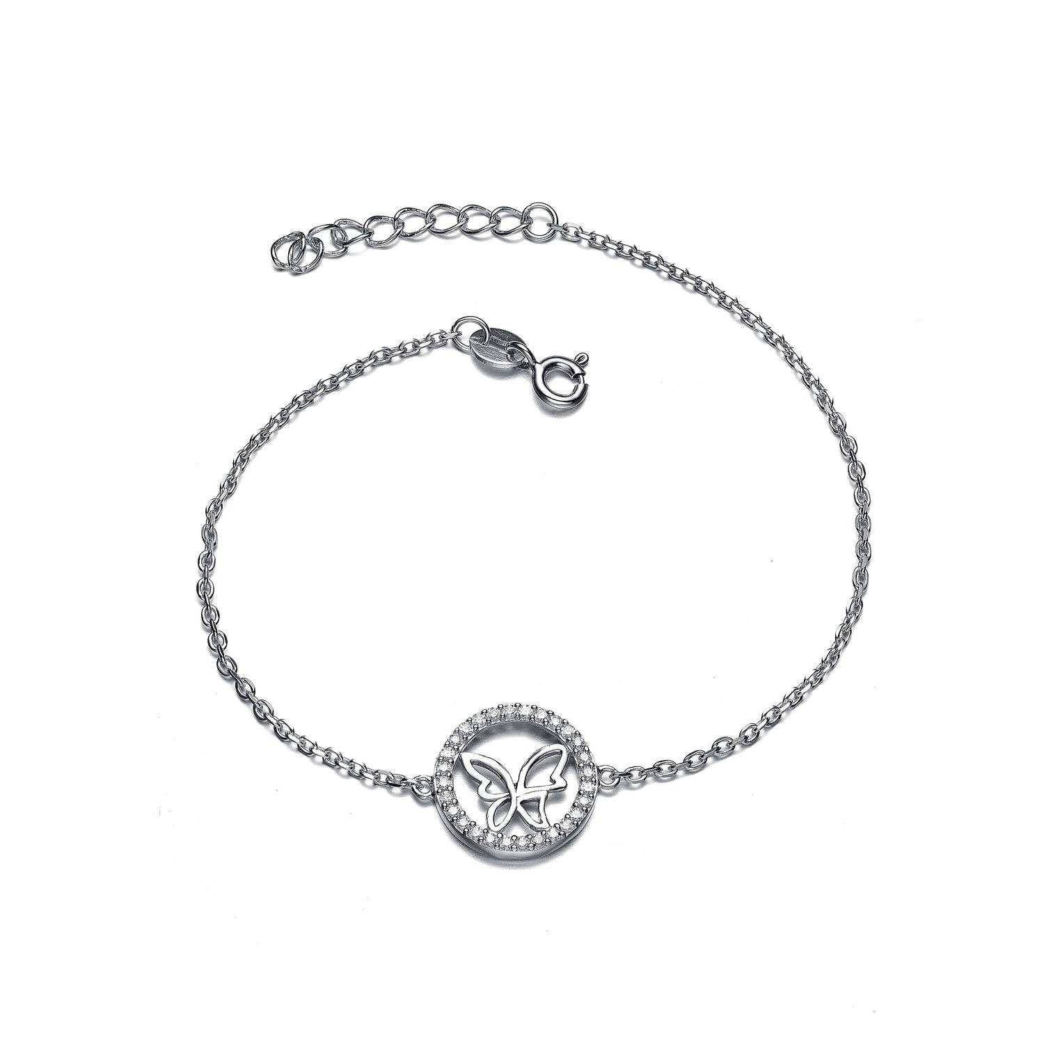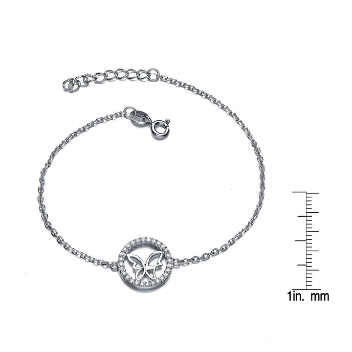 Sterling Silver White Gold Plated With Clear Cubic Zirconia Circle Frame Butterfly Bracelet