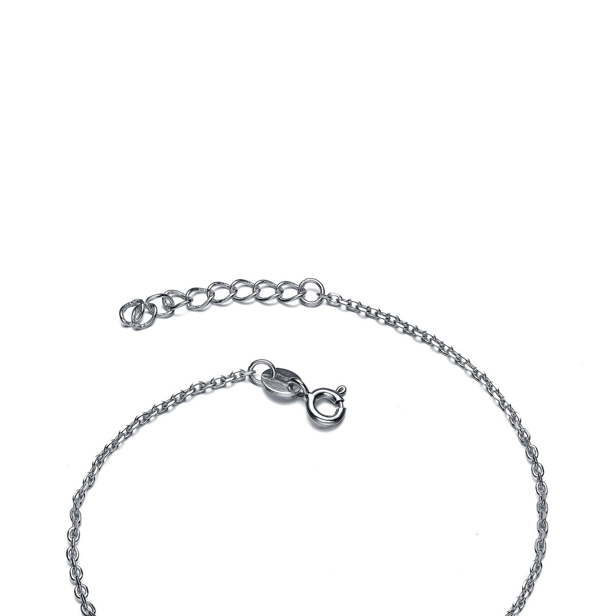 This chain bracelet is crafted from .925 sterling silver with white gold plating and is set with a clear cubic zirconia butterfly within a circular frame. It secures with a spring ring clasp.