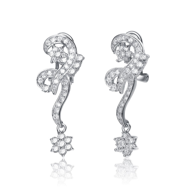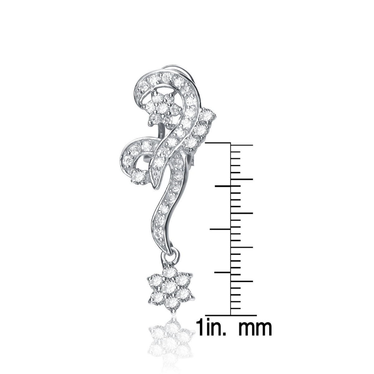 These dangle earrings are crafted from sterling silver with white gold plating and are encrusted with clear cubic zirconia stones in a filigree design.