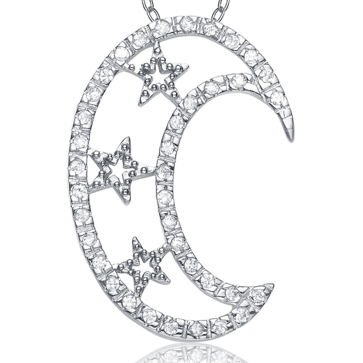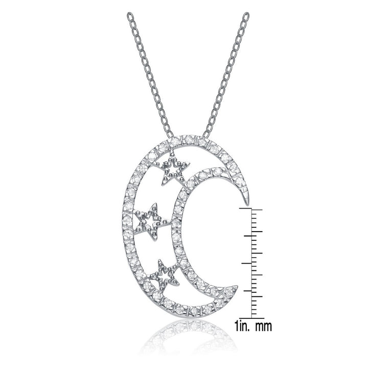 This Sterling Silver White Cubic Zirconia Half Moon Pendant by Genevive Jewelry is a charming and intricate piece with a celestial vibe. The elegant half-moon design, adorned with small white cubic zirconia stones, holds three five-pointed stars, creating a whimsical and dreamy feel. This pendant is a beautiful symbol of hope and guidance, making it a meaningful accessory for anyone who seeks a touch of magic in their daily life.