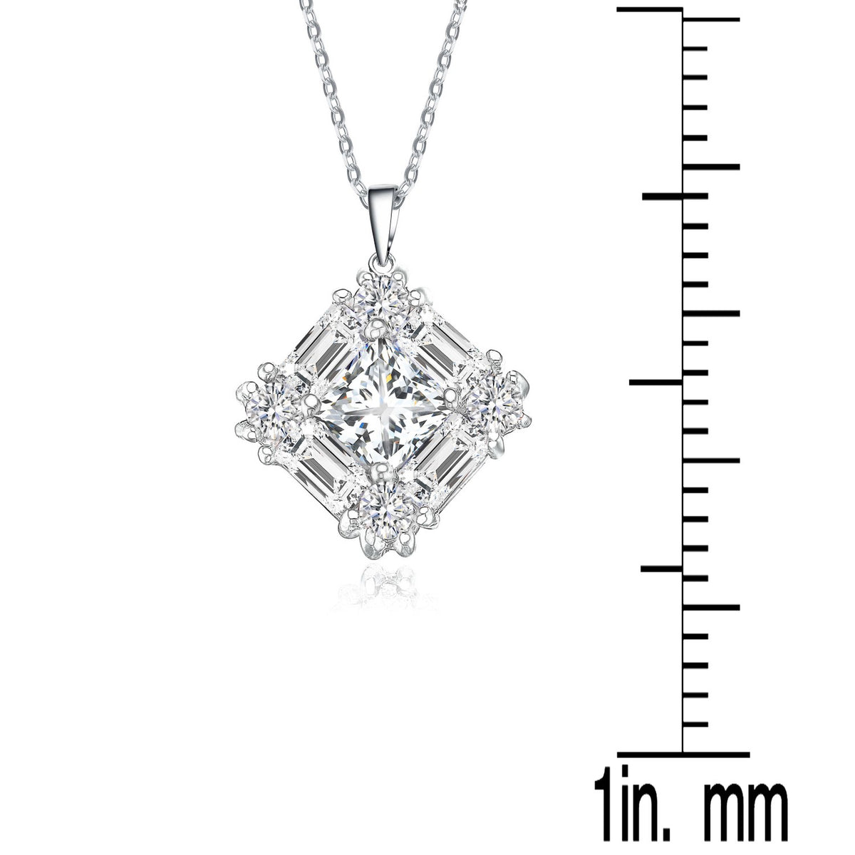 This necklace is crafted from .925 sterling silver and features a square-cut cubic zirconia stone, decorated with baguette and round-cut stones. It secures with a spring ring clasp. To maintain its appearance, clean with a suede cloth and avoid contact with water.