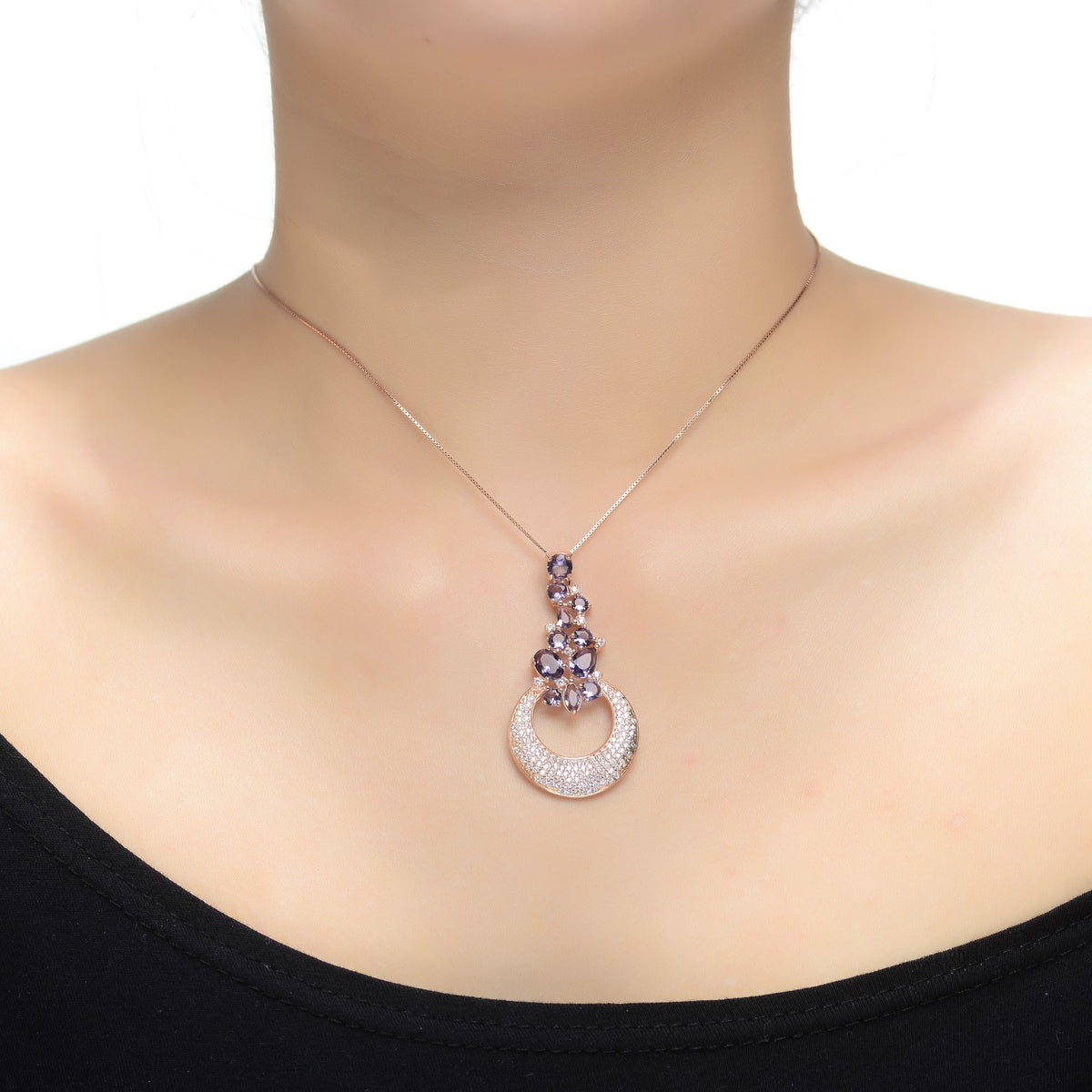 This pendant necklace is crafted from .925 sterling silver with rose gold plating. It features a crescent moon-inspired design with purple cubic zirconia and pave-set clear gemstones. It comes with a cable chain and is secured by a spring ring.