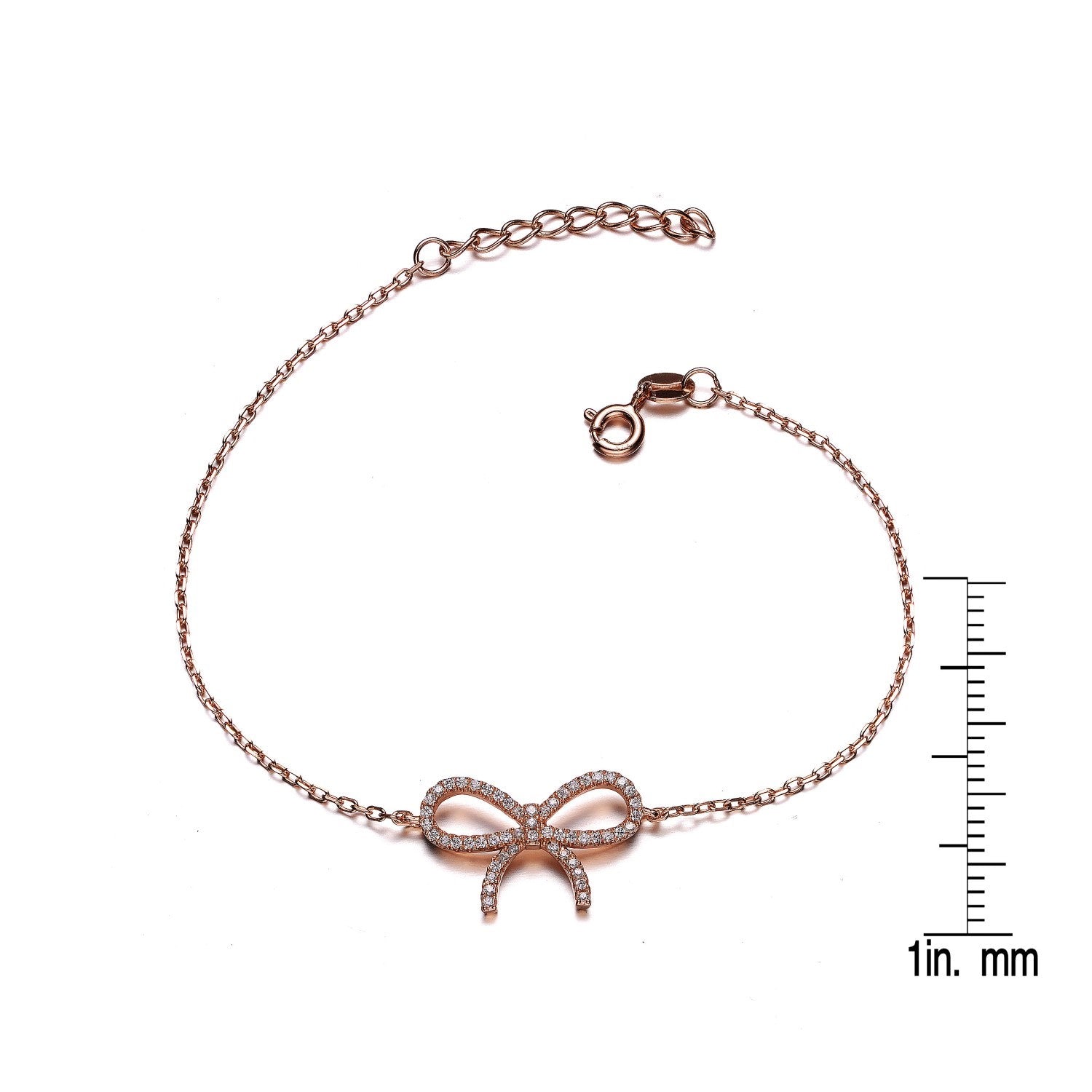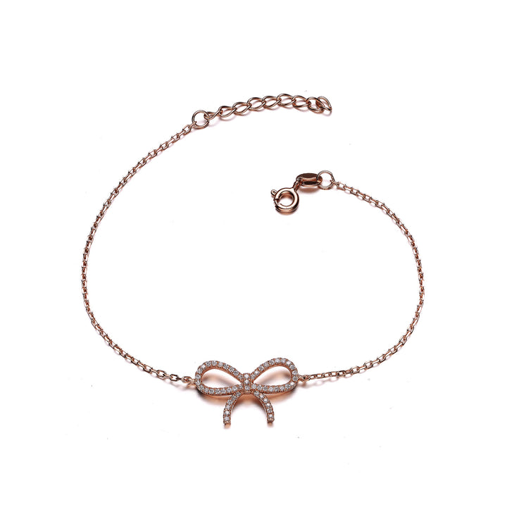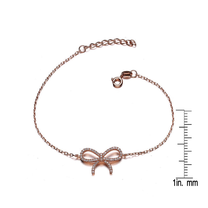This bracelet is crafted from sterling silver with rose gold plating. It features a bow design accented with clear cubic zirconia stones. To maintain its shine, clean with a suede cloth and avoid contact with water.