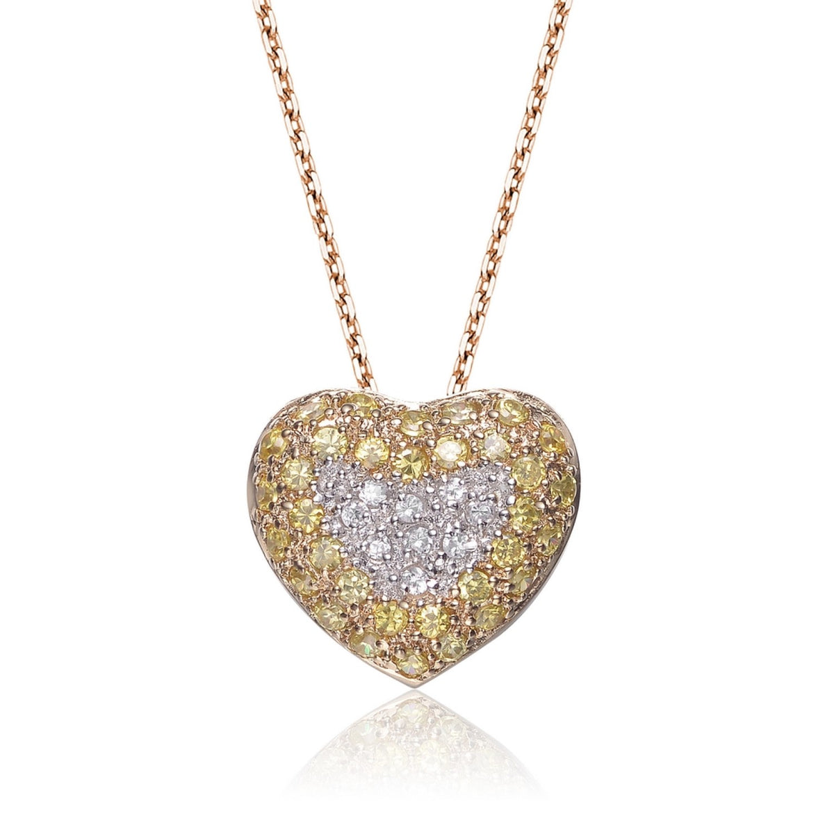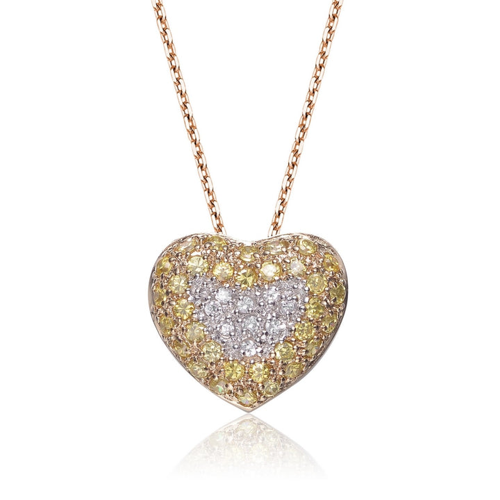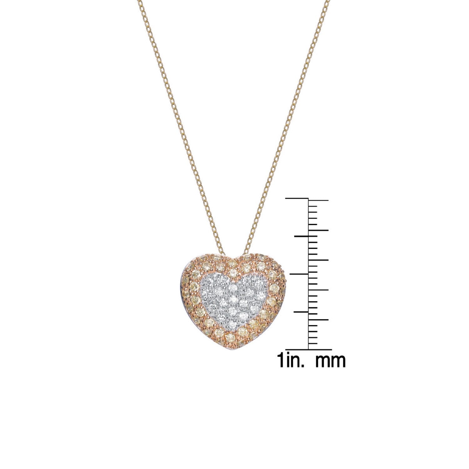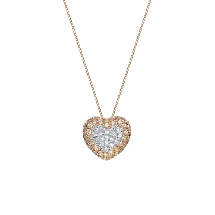 This heart-shaped pendant is crafted from sterling silver and is covered with white and gold-colored cubic zirconia stones. To maintain its shine, clean with a suede cloth and avoid contact with water.