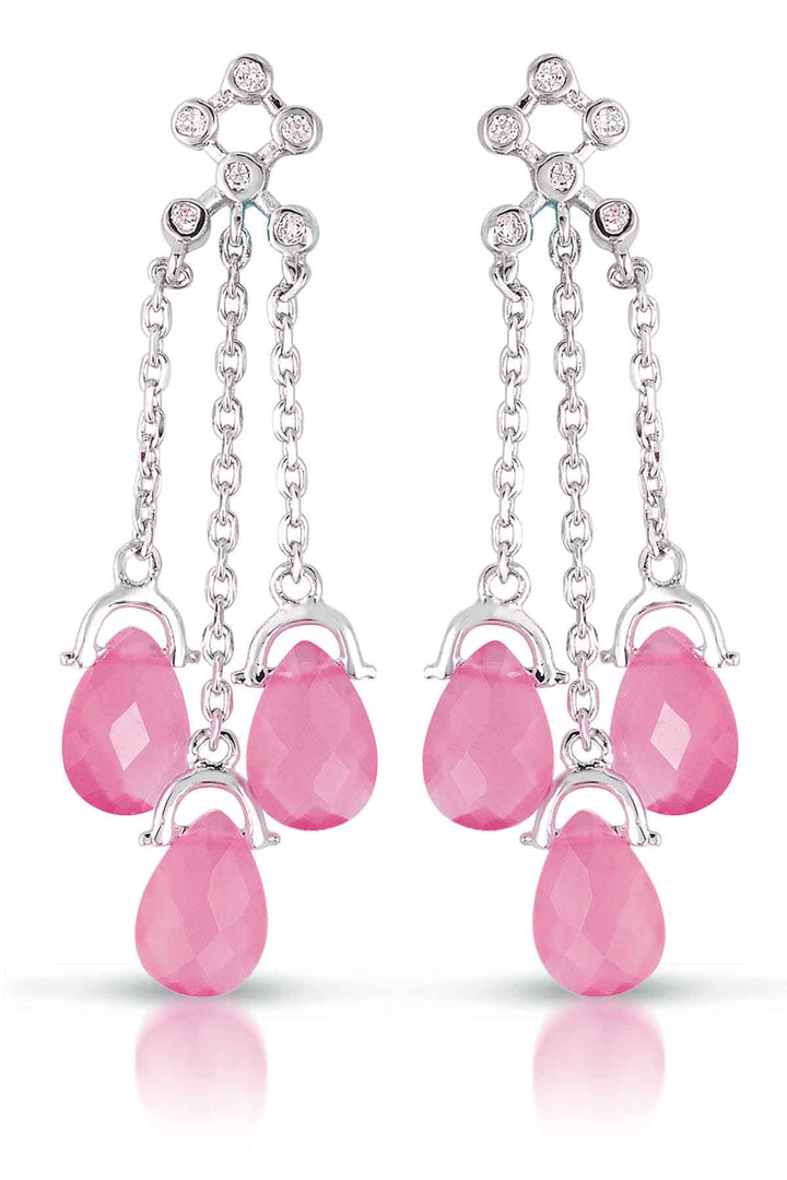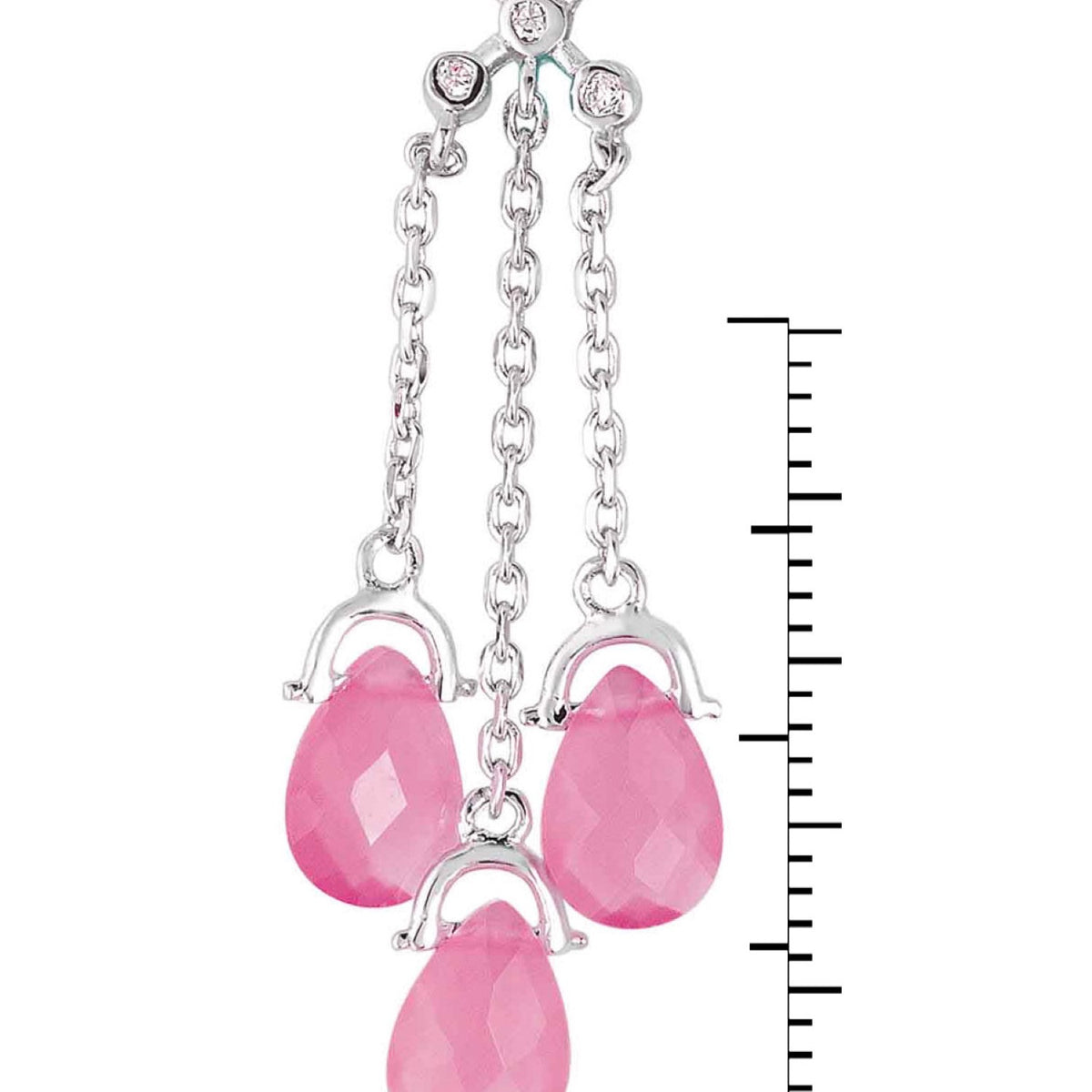 These dangle earrings are crafted from sterling silver with white gold plating. They feature three strands with pink cubic zirconia stones. To maintain their appearance, clean with a suede cloth and avoid contact with water.