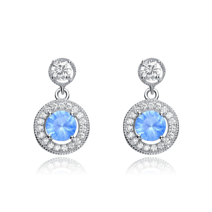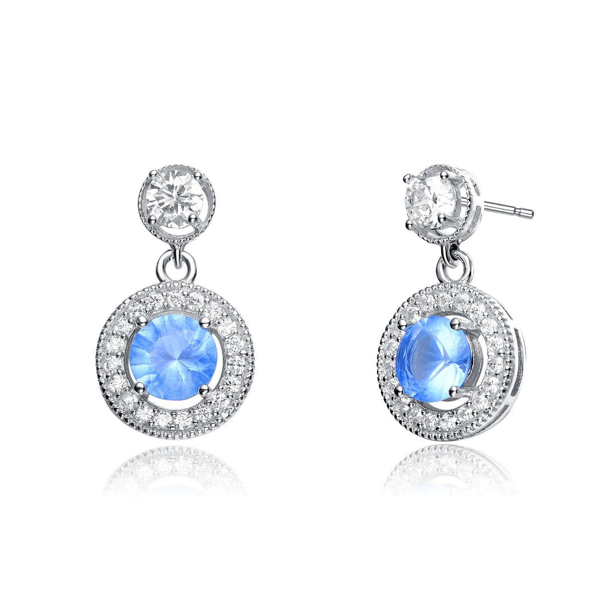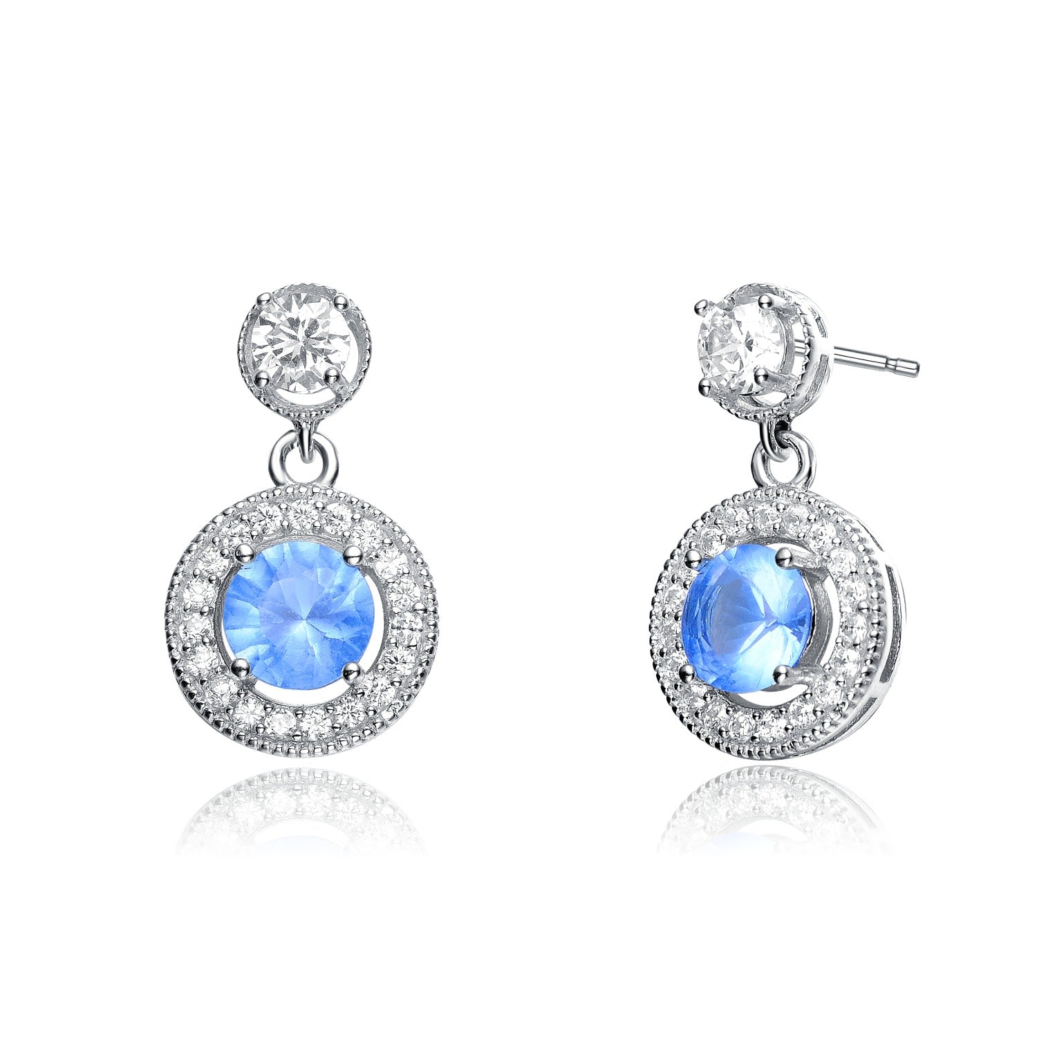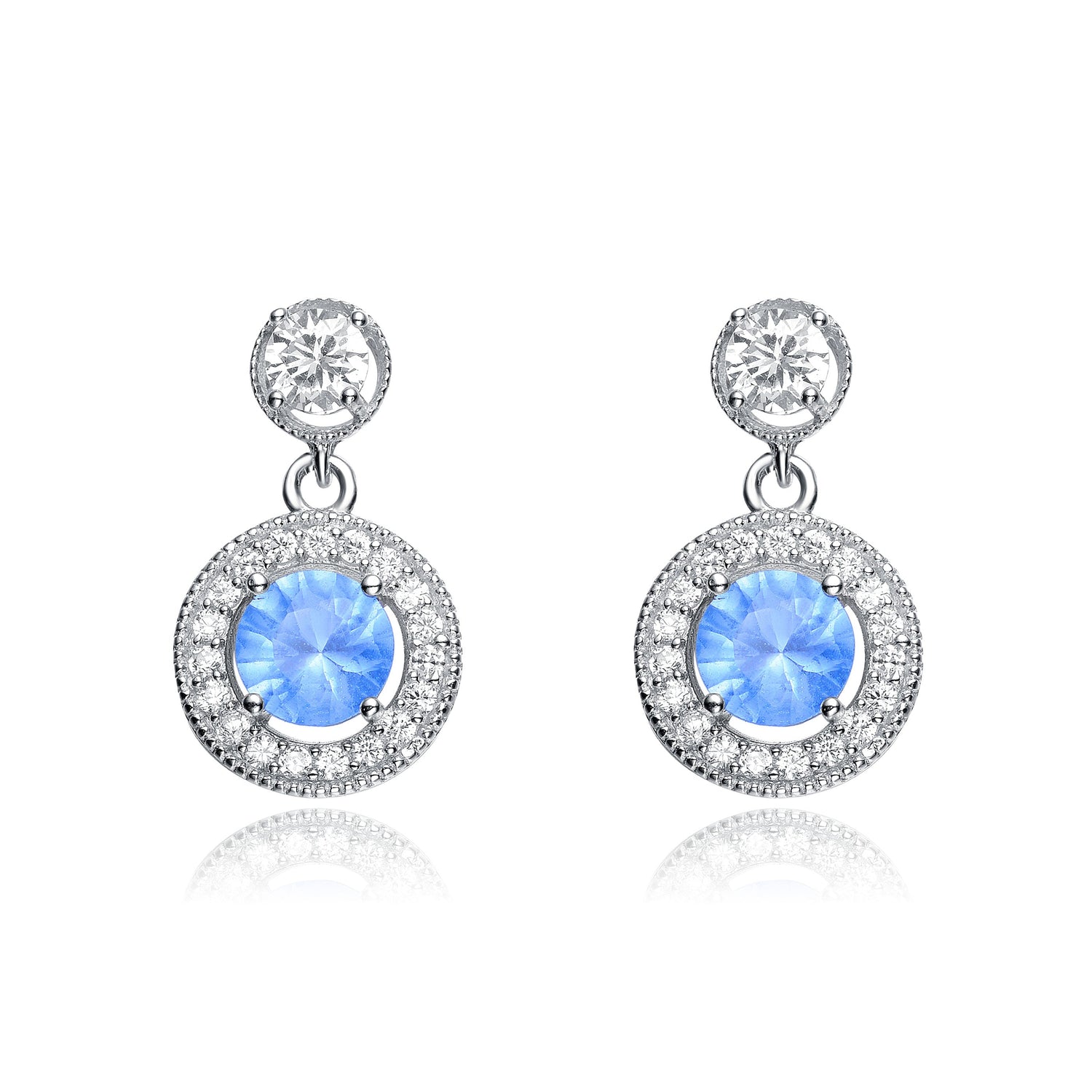 These drop earrings are crafted from 0.925 sterling silver and are white gold plated. They feature turquoise cubic zirconia and white round-cut cubic zirconia stones. To maintain their quality, use a suede cloth to clean them and avoid contact with water.