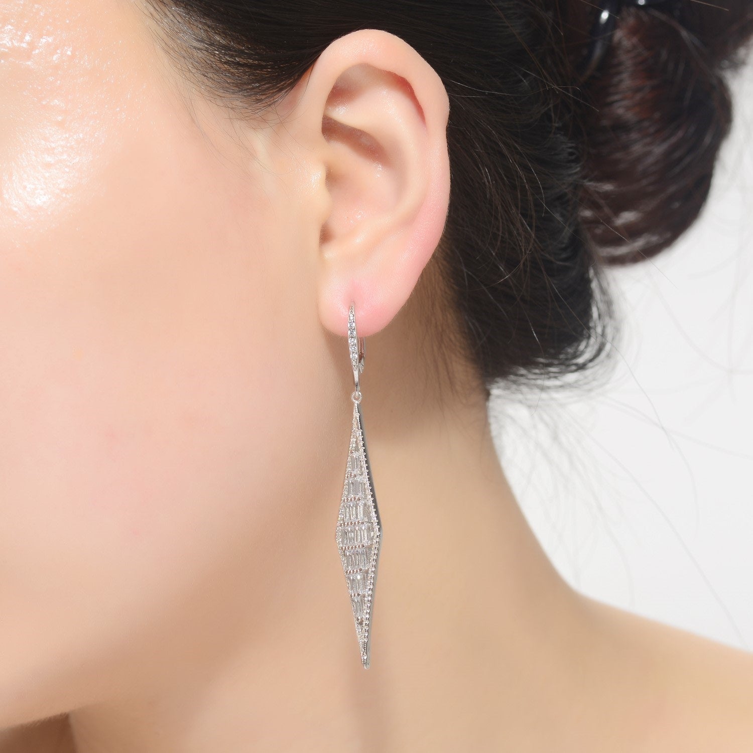 These dangle earrings are crafted from sterling silver with a white gold or 18k rose gold plated finish and feature cubic zirconia stones. They measure 72mm. To maintain their quality, use a suede cloth to clean them and avoid contact with water.
