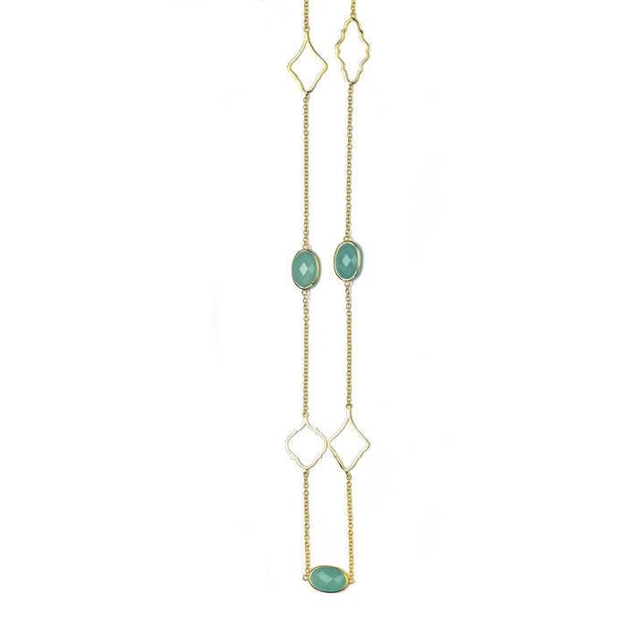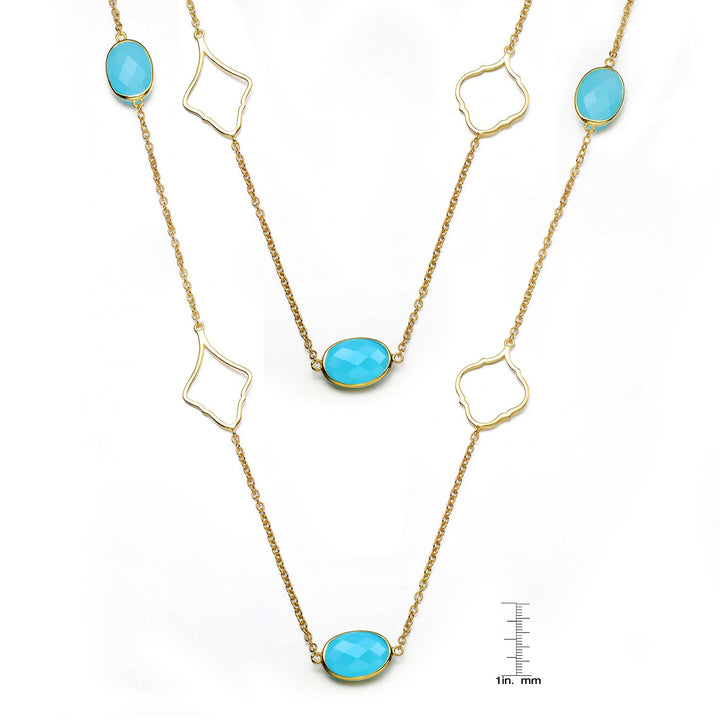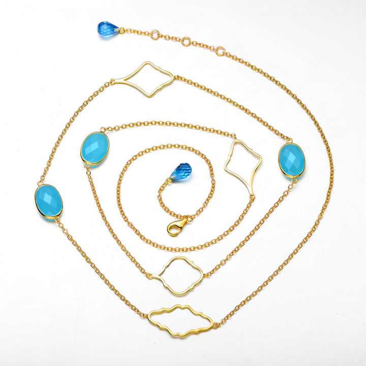 This double necklace is crafted from sterling silver with a gold-plated finish and features oval light blue cubic zirconia stones. To maintain its quality, use a suede cloth to clean it and avoid contact with water.
