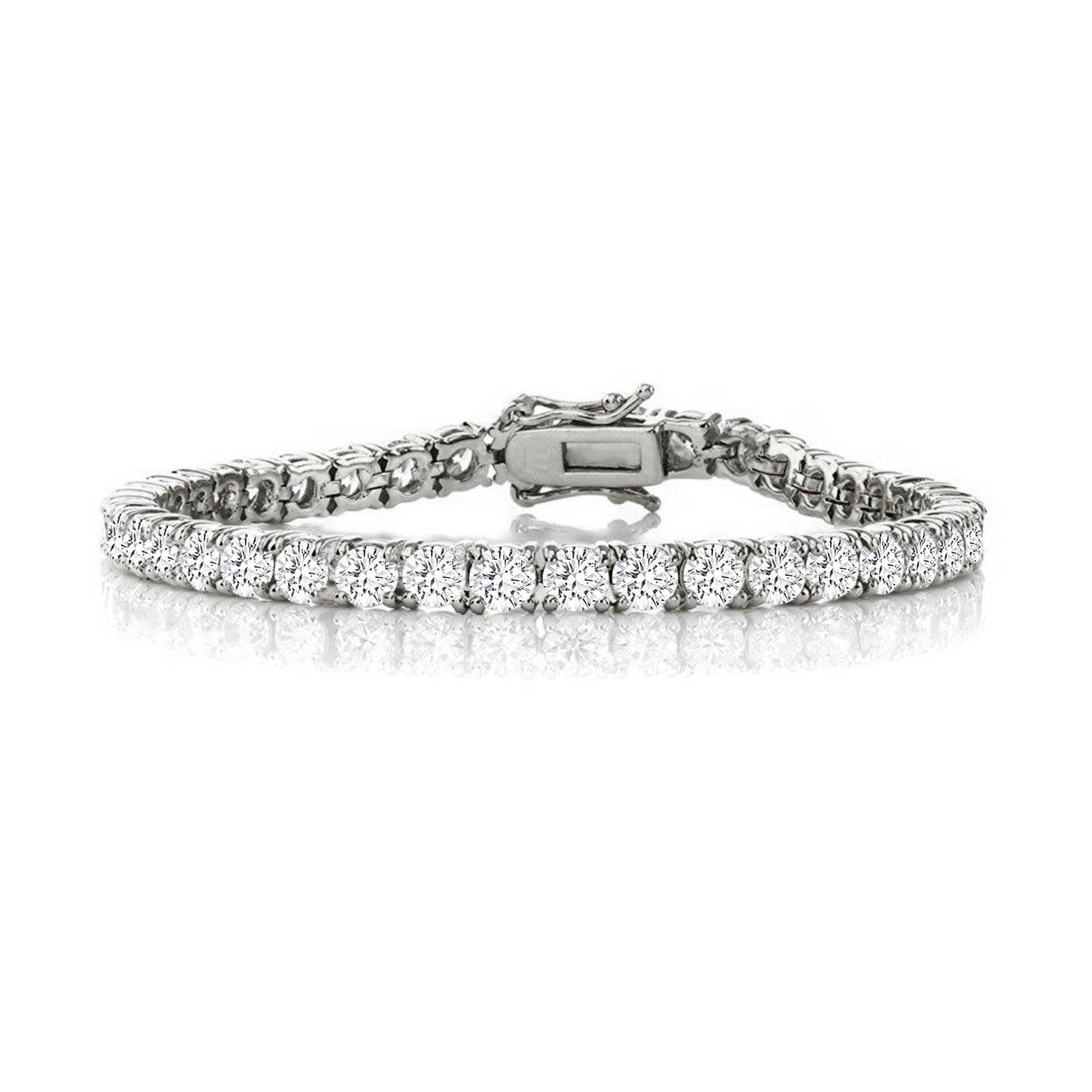 This tennis bracelet is crafted with white gold plating and features cubic zirconia. To clean it, wipe it with a cloth. Avoid contact with water.