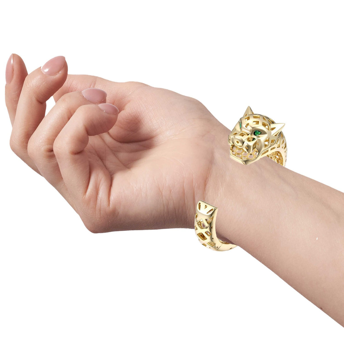 The Rachel Glauber Gold Plated Sterling Silver With Emerald Cubic Zirconia Jaguar Open Cuff Bangle Bracelet by Genevive Jewelry Jewelry is a confident and glamorous accessory. This beautiful bangle features a jaguar wildcat sparkling with vibrant green emerald cubic zirconia eyes. A rich 14k yellow gold plated sterling silver brings out the luxurious details of this fashionable bangle.
